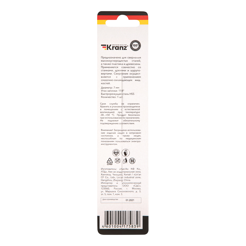 Сверло по металлу 7,0х109х69мм (HSS), DIN 338, 1 шт. в упаковке KRANZ