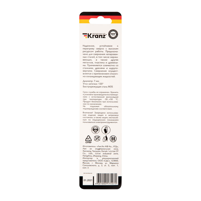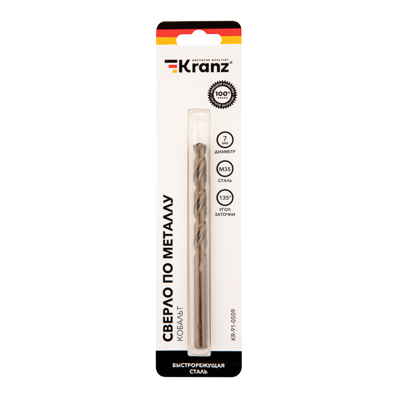 Сверло по металлу 7х109х69мм «Кобальт» (сталь HSS-Co 5% M35 P6M5K5) DIN 338, 1 шт. в блистере KRANZ
