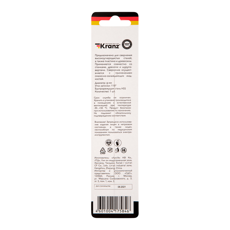 Сверло KRANZ изготовлено по стандарту DIN 338 и используется для сверления отверстий в таких материалах, как сталь, дерево и пластик.