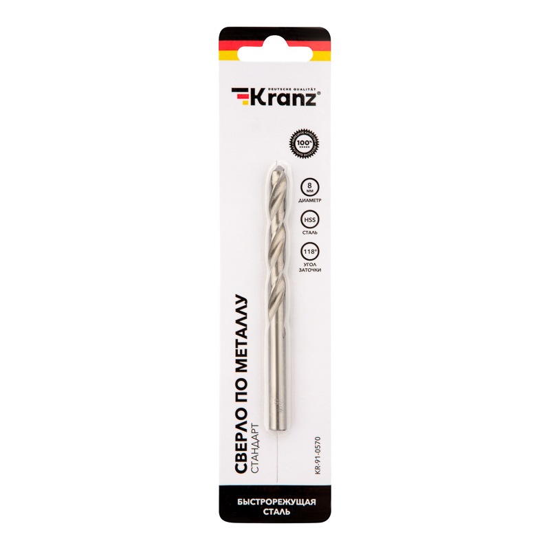 Сверло по металлу 8,0х117х75мм (HSS), DIN 338, 1 шт. в упаковке KRANZ