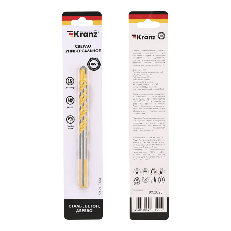 Сверло универсальное твердосплавное, 10мм KRANZ