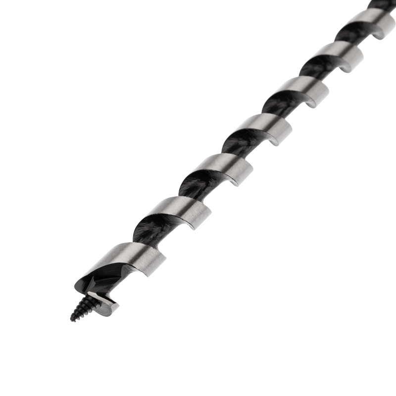 Сверло выполнено из закаленной инструментальной стали, что повышает износостойкость и долговечность инструмента. Центрирующее острие на конце рабочей части позволяет удобно засверливаться в материал и уменьшает осевую нагрузку, шнековая спираль Левиса обработана до зеркального блеска, из-за чего отверстия получаются гладкими, а стружка отводится более эффективно. Хвостовая часть, выполненная в виде шестигранника, надежно фиксирует сверло в патроне инструмента.