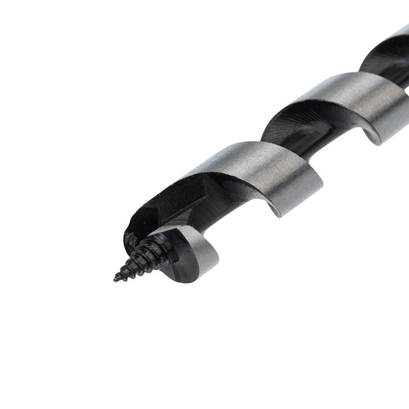 Сверло выполнено из закаленной инструментальной стали, что повышает износостойкость и долговечность инструмента. Центрирующее острие на конце рабочей части позволяет удобно засверливаться в материал и уменьшает осевую нагрузку, шнековая спираль Левиса обработана до зеркального блеска, из-за чего отверстия получаются гладкими, а стружка отводится более эффективно. Хвостовая часть, выполненная в виде шестигранника, надежно фиксирует сверло в патроне инструмента.