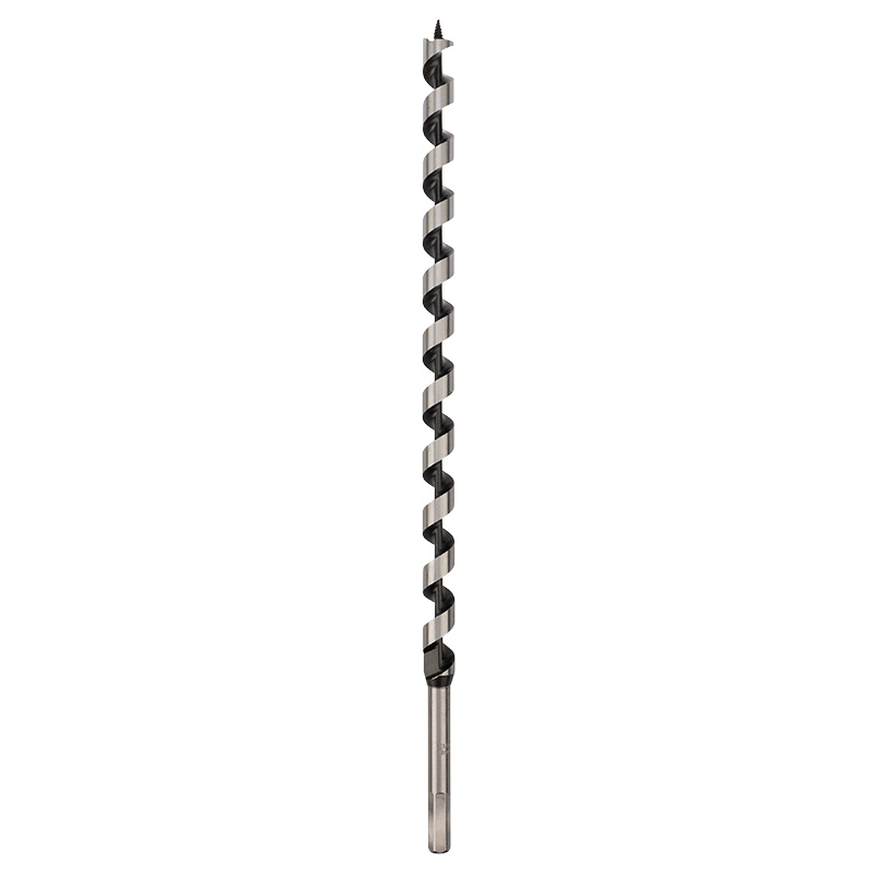 Сверло выполнено из закаленной инструментальной стали, что повышает износостойкость и долговечность инструмента. Центрирующее острие на конце рабочей части позволяет удобно засверливаться в материал и уменьшает осевую нагрузку, шнековая спираль Левиса обработана до зеркального блеска, из-за чего отверстия получаются гладкими, а стружка отводится более эффективно. Хвостовая часть, выполненная в виде шестигранника, надежно фиксирует сверло в патроне инструмента.