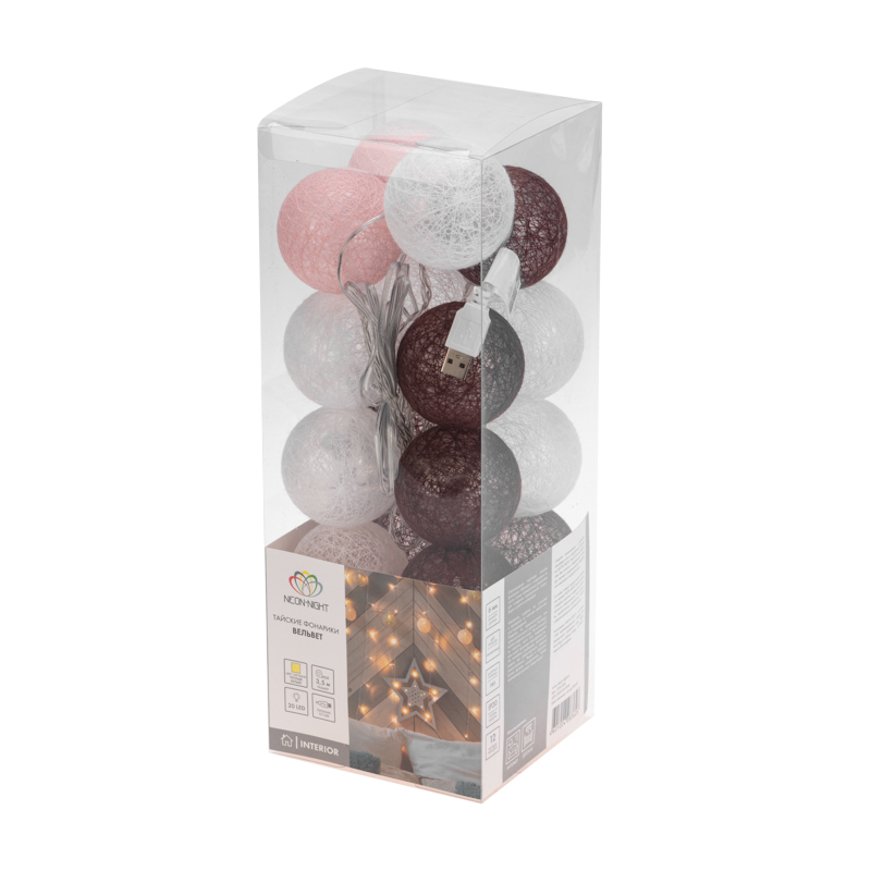 Цветовое решение изделия гармонично сочетает спокойные оттенки: молочный, персиковый, коричневый. В качестве источника питания гирлянды выступает USB-разъем, который крепится на дополнительный провод длиной 30 см.