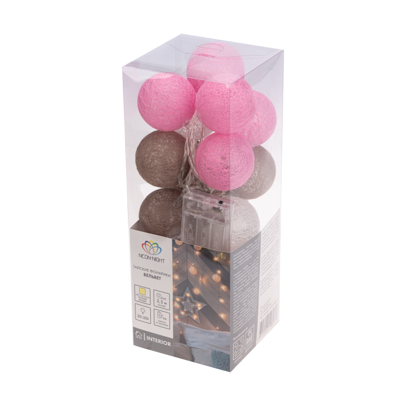 Тайские фонарики «Вельвет» — светодиодная гирлянда, которая станет оригинальным, эффектным украшением интерьера даже в выключенном состоянии благодаря необычному оформлению. На проводе, помещенном в прозрачную изоляцию из ПВХ, находятся 20 волшебных круглых фонариков из хлопковых нитей нити. Цветовое решение изделия гармонично сочетает спокойные оттенки: молочный, персиковый, коричневый. Декоративные элементы мягко подсвечиваются диодами, которые питаются от 3 батареек АА. Автономное питание светодиодных украшений — это безопасное решение для оформления детских комнат. Гирлянда IP20 предназначена для использования в помещениях.