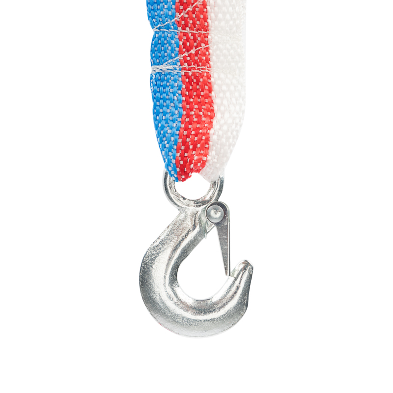 Трос изготовлен из полипропилена, отличающегося стойкостью к низким температурам и резкому изменению влажности. На концах изделия расположены металлические крюки с пружинным фиксатором.