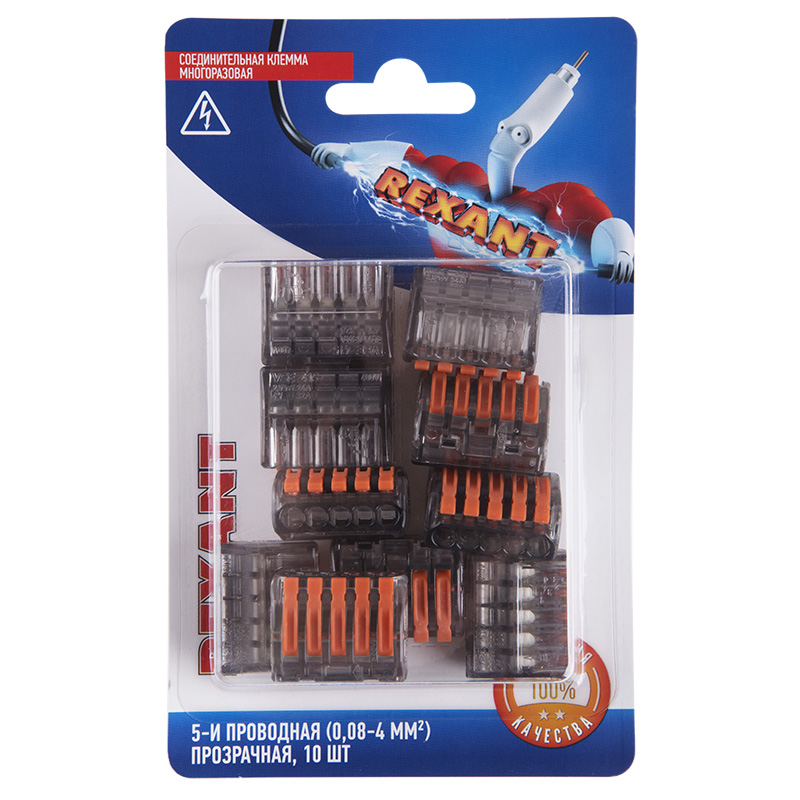 Соединительная многоразовая клемма на 5 проводника с плоско-пружинным зажимом предназначена для подсоединения медных одножильных и многожильных проводников тонкого сечения. Клемма изготовлена из полиамида 66, имеет 5 контакта, цвет корпуса прозрачный, напряжение 400 В.