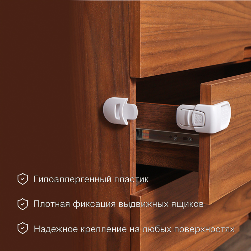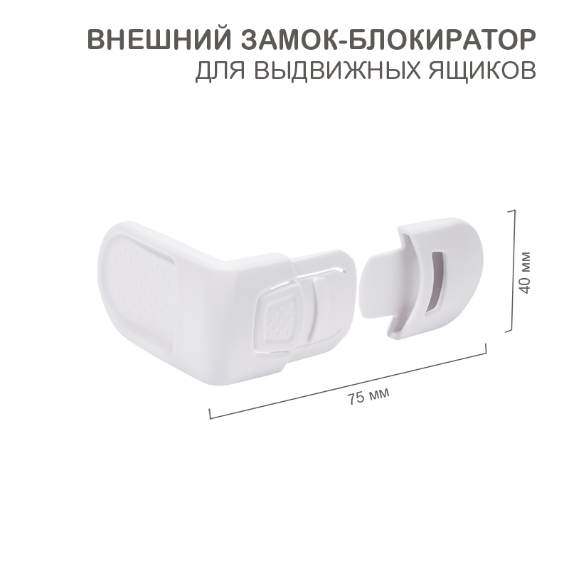 Скругленный блокиратор предназначен для защиты детей от возможных травм, связанных с открыванием выдвижных ящиков. Благодаря этому устройству, ребенок не сможет случайно открыть ящик, где находятся острые предметы или опасные химические вещества.