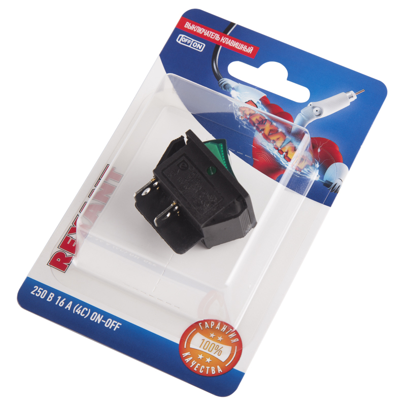 Выключатель клавишный 250В 16А (4с) ON-OFF зеленый с подсветкой (1 шт/уп) REXANT