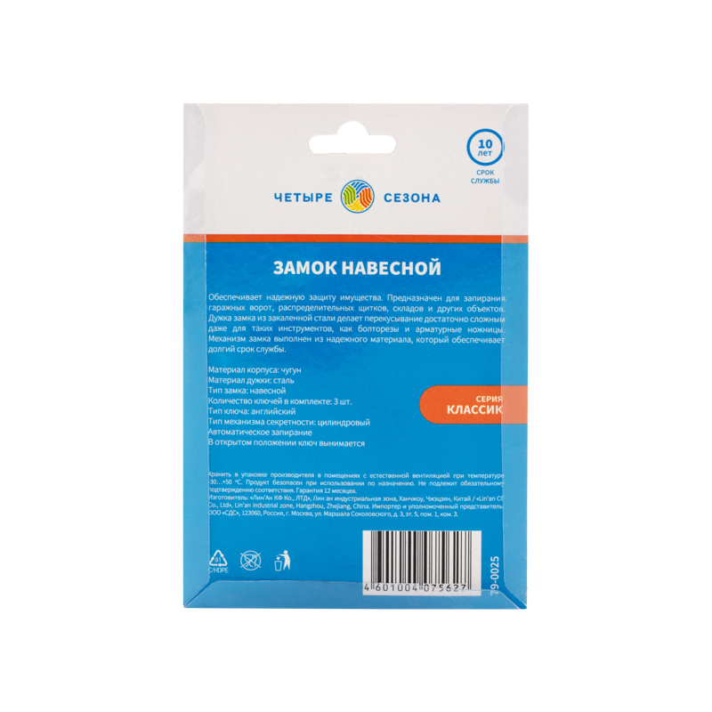 Навесной замок ЧЕТЫРЕ СЕЗОНА предназначен для защиты личного имущества. Используется для запирания гаражных ворот, распределительных щитков, складов и других объектов.