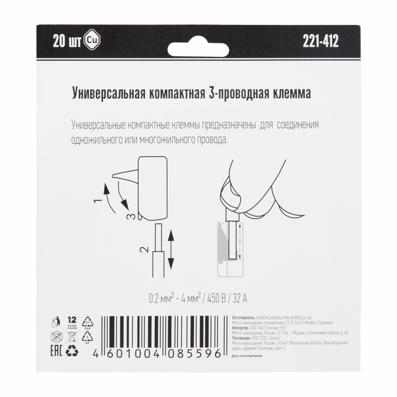 Оригинальная соединительнаяна многоразовая клемма WAGO (221-412) на 2 проводника с плоско-пружинным зажимом предназначена для подсоединения до 2 зачищенных проводников тонкого сечения ( от 0,08 мм² до 4 мм², одно- и многожильных до 2,5 мм²).Номинальный ток 32А; Номинальное напряжение 450В.