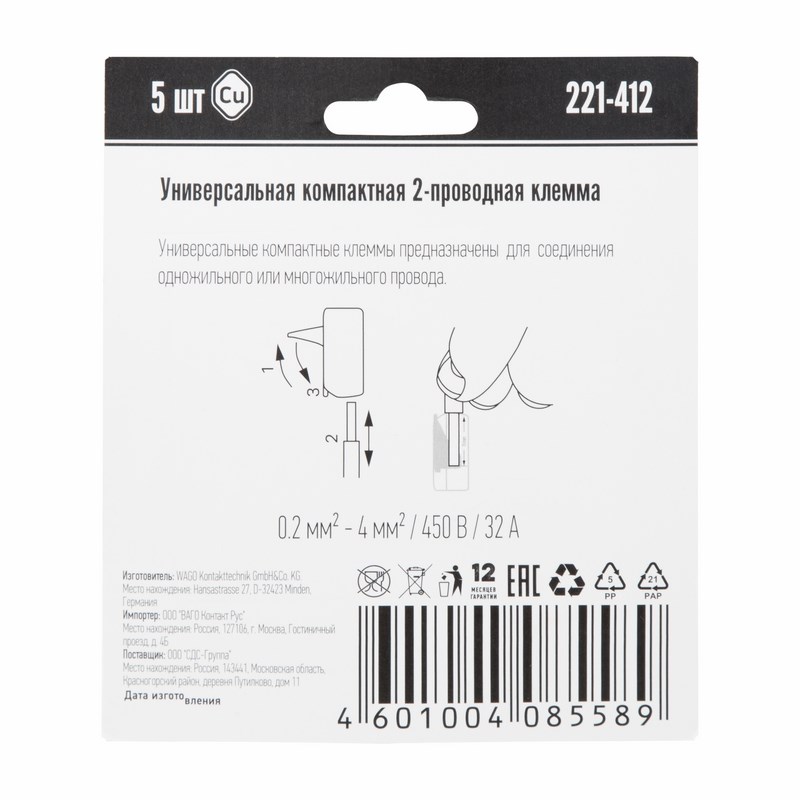 Оригинальная соединительнаяна многоразовая клемма WAGO (221-412) на 2 проводника с плоско-пружинным зажимом предназначена для подсоединения до 2 зачищенных проводников тонкого сечения ( от 0,08 мм² до 4 мм², одно- и многожильных до 2,5 мм²).Номинальный ток 32А; Номинальное напряжение 450В.