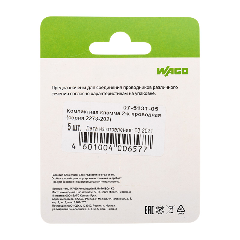 2273-202 Экcпресс-клемма, 2-проводная до 2,5 мм², (5 шт/уп) WAGO