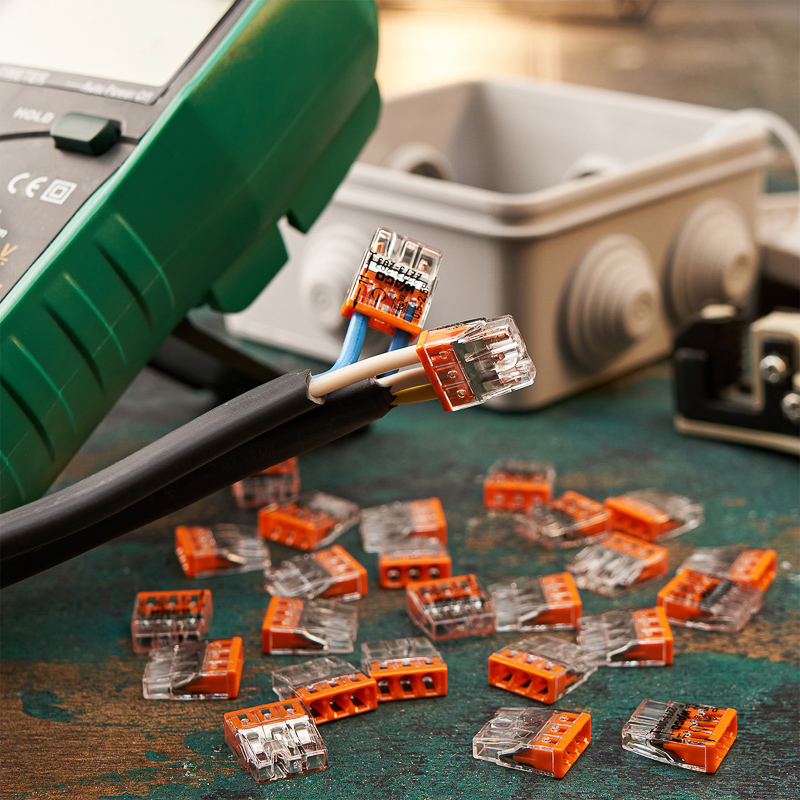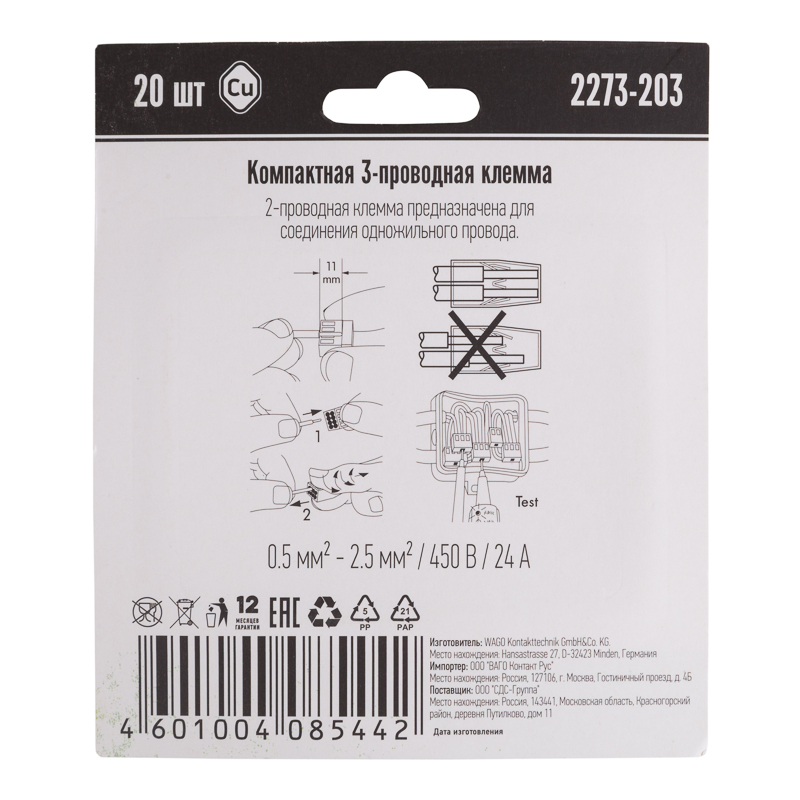 Электромонтажные экспресс-клемы WAGO 2273-203 позволят безопасно и быстро соединить 3 провода между собой (алюминиевые и медные как одножильные, так и многожильные). Достаточно просто вставить жилу кабеля или провода в клемму и самозажимной контакт надежно зафиксирует соединение. Диаметр соединяемых проводов должен составлять в сечении от 0,5 до 2,5 мм2. Номинальный ток 24А; Номинальное напряжение 450В. Удобные тестовые гнезда, прозрачный корпус для визуального контроля и смотровое окно для проверки защиты от касаний делают работу более безопасной.
