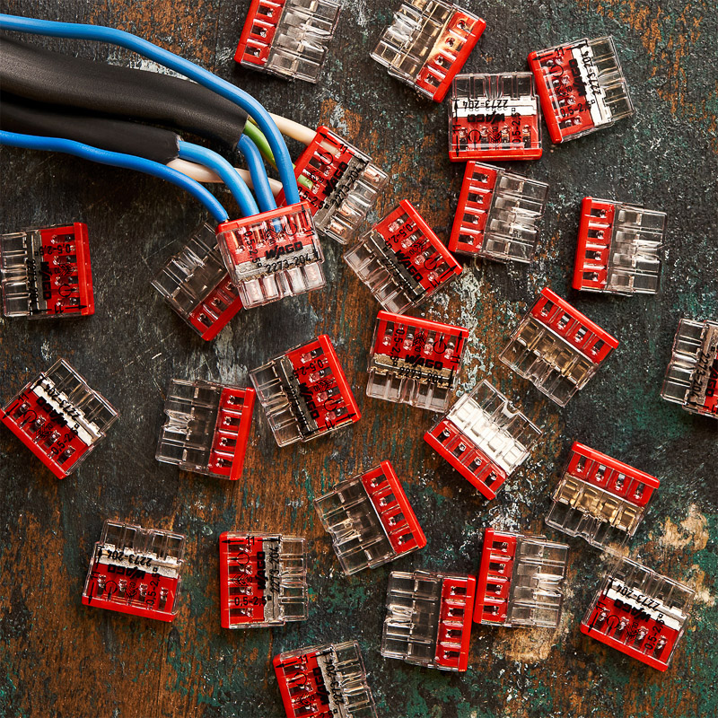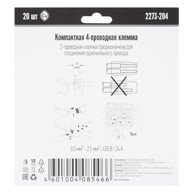 Электромонтажные экспресс-клемы WAGO 2273-204 позволят безопасно и быстро соединить 4 провода между собой (алюминиевые и медные как одножильные, так и многожильные). Достаточно просто вставить жилу кабеля или провода в клемму и самозажимной контакт надежно зафиксирует соединение. Диаметр соединяемых проводов должен составлять в сечении от 0,5 до 2,5 мм2. Номинальный ток 24А; Номинальное напряжение 450В. Удобные тестовые гнезда, прозрачный корпус для визуального контроля и смотровое окно для проверки защиты от касаний делают работу более безопасной.
