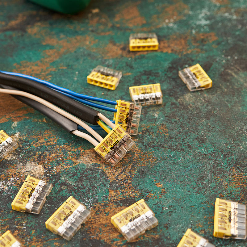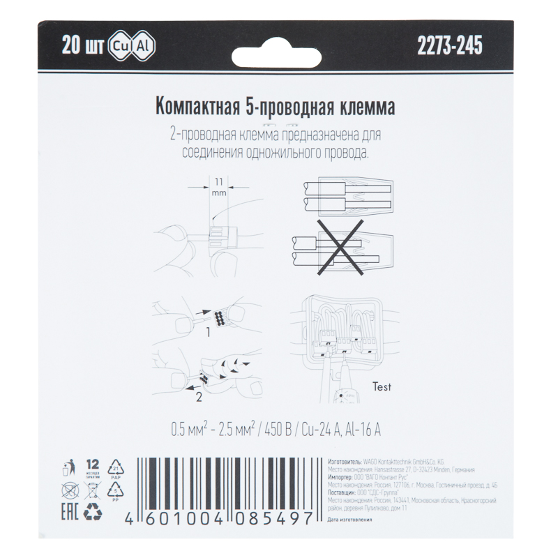 Элетромонтажные экспресс-клемы WAGO 2273-245 позволят безопасно и быстро соединить 5 проводов между собой (алюминиевые и медные как одножильные, так и многожильные). Достаточно просто вставить жилу кабеля или провода в клемму и самозажимной контакт надежно зафиксирует соединение. Диаметр соединяемых проводов должен составлять в сечении от 0,5 до 2,5 мм2. Номинальный ток 24А; Номинальное напряжение 450В. Удобные тестовые гнезда, прозрачный корпус для визуального контроля и смотровое окно для проверки защиты от касаний делают работу более безопасной. Наличие пасты обеспечивает надёжную изоляцию контакта