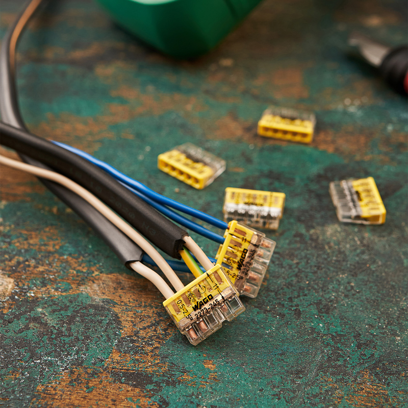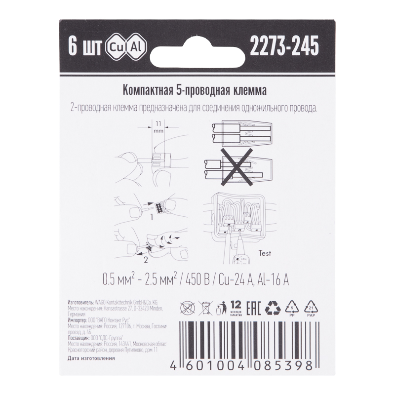 Элетромонтажные экспресс-клемы WAGO 2273-245 позволят безопасно и быстро соединить 5 проводов между собой (алюминиевые и медные как одножильные, так и многожильные). Достаточно просто вставить жилу кабеля или провода в клемму и самозажимной контакт надежно зафиксирует соединение. Диаметр соединяемых проводов должен составлять в сечении от 0,5 до 2,5 мм2. Номинальный ток 24А; Номинальное напряжение 450В. Удобные тестовые гнезда, прозрачный корпус для визуального контроля и смотровое окно для проверки защиты от касаний делают работу более безопасной. Наличие пасты обеспечивает надёжную изоляцию контакта