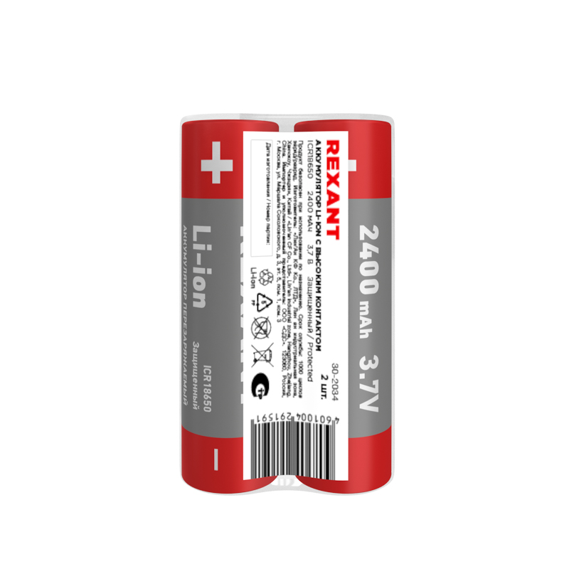 Типоразмер – 18650. Емкость – 2400 мАч. Напряжение – 3,7 В. Электрохимическая система – литий-ионные. Предусмотрена защита от чрезмерного заряда/разряда.