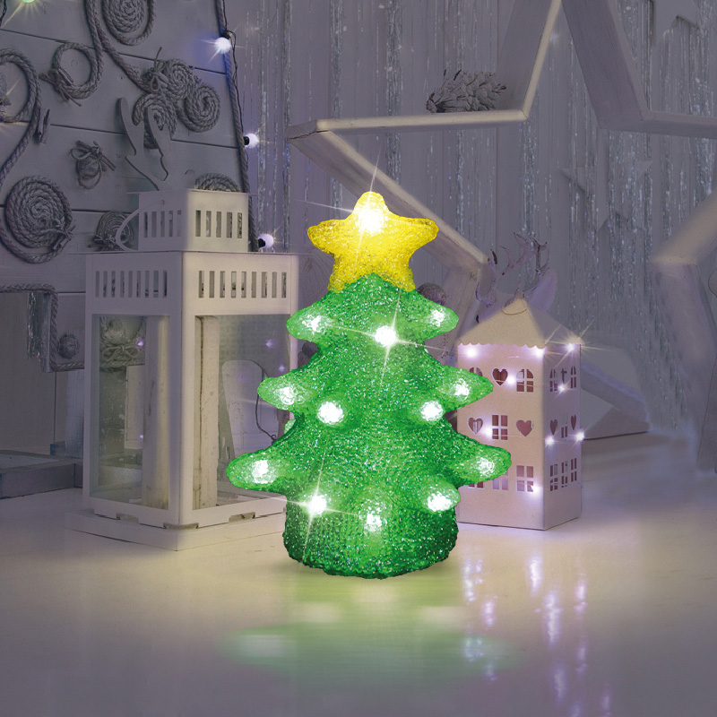 Светодиодная фигура «Елочка» высотой 22 см выполнена из акрила с применением технологии нанесения материала, которая обеспечивает приятную фактурную поверхность. 20 ярких диодов излучают приятный белый свет и эффектно подсвечивают композицию изнутри. Двух батареек типа АА, устанавливаемых в аккумуляторный блок, хватает более чем на 48 часов непрерывной работы. Светодиодная фигура «Елочка» станет оригинальным украшением интерьера, подарит праздничное настроение окружающим. Декоративное изделие на батарейках абсолютно безопасно — подходит для размещения в детских комнатах.
