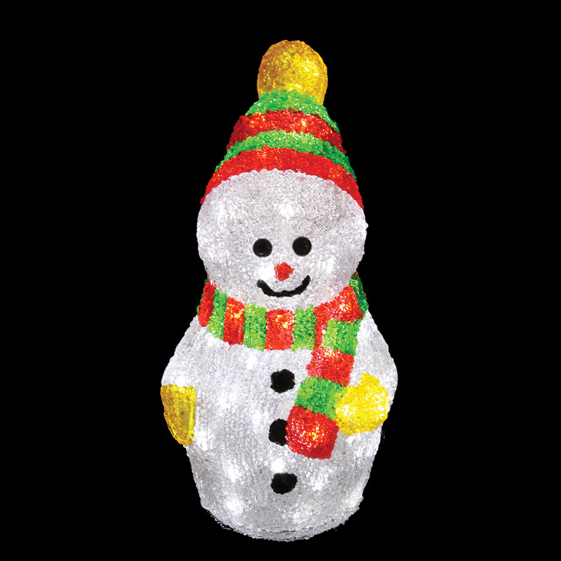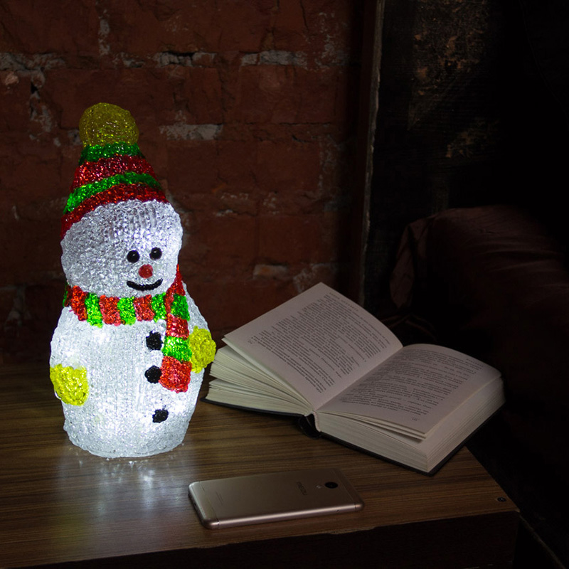 Акриловая светодиодная фигура «Снеговик с шарфом» высотой 30 см со степенью защиты IP65 подходит для использования как в помещении, так и на улице. Оригинальное изделие выполнено из прочного фактурного акрила в виде забавного новогоднего персонажа. Яркие детали — цветные шарф и шапочка эффектно дополняют образ. 40 экономичных светодиодов излучают белый свет, мягко подсвечивая композицию. Акриловая фигура укомплектована трансформатором на 24 В, который позволяет подключать светодиодный декор к стандартной сети 230 В.