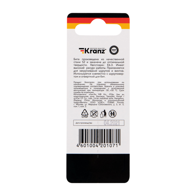 Изготовлена из легированной высокопрочной стали S2, что дает повышенную устойчивость к изломам и деформации в наиболее нагружаемых точках касания. Размер наконечника HEX-6 подходит для работы со шлицами с резьбовым диаметром 6 мм. Намагниченный наконечник облегчает крепление и фиксацию крепежа на бите. Шестигранный хвостовик надежно фиксирует биту в патроне инструмента и не дает ей проворачиваться.