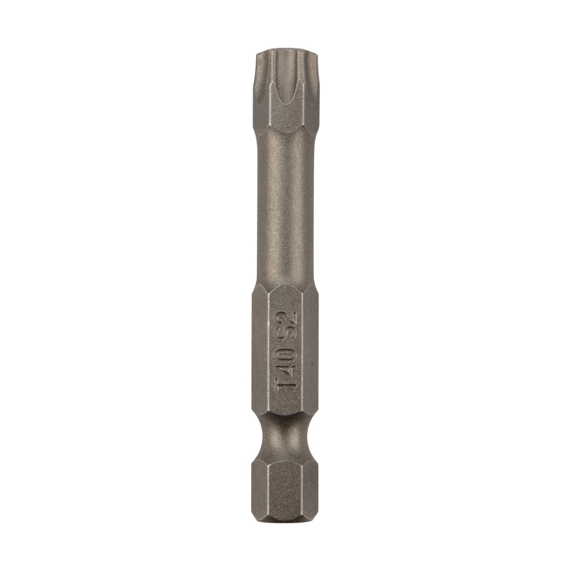 Изготовлена из легированной высокопрочной стали S2, что дает повышенную устойчивость к изломам и деформации в наиболее нагружаемых точках касания. Размер наконечника T-40 подходит для работы со шлицами с резьбовым диаметром 6,65 мм. Намагниченный наконечник облегчает крепление и фиксацию крепежа на бите. Шестигранный хвостовик надежно фиксирует биту в патроне инструмента и не дает ей проворачиваться.