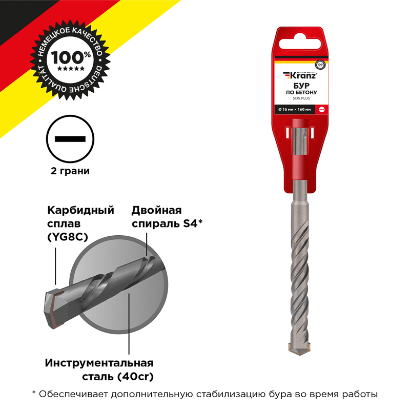 Конструкция со стабилизирующей спиралью сохраняет точное положение бура во время сверления и равномерно распределяет ударную нагрузку.