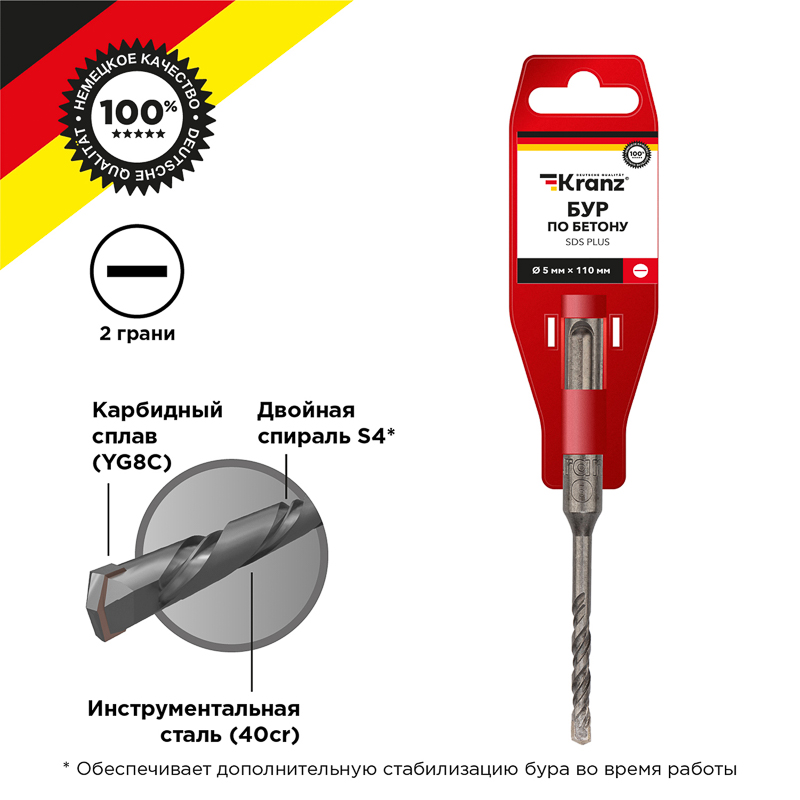 Бур с хвостовиком SDS PLUS KRANZ используется во время строительных и ремонтных работ. Предназначен для сверления и бурения отверстий в граните, бетоне, кирпичной кладке и камне при помощи перфоратора с креплением SDS PLUS, которое применяется в большинстве электроинструментов бытового и профессионального назначения.