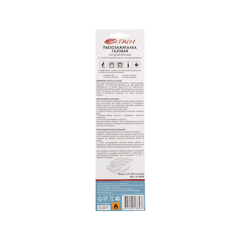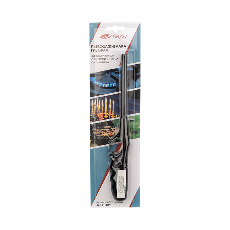 Бытовая газовая пьезозажигалка с классическим пламенем, многоразовая (1 шт.) черная СК-302L СОКОЛ