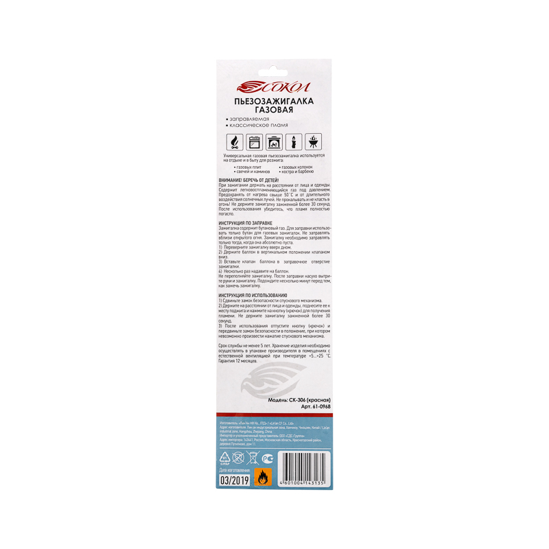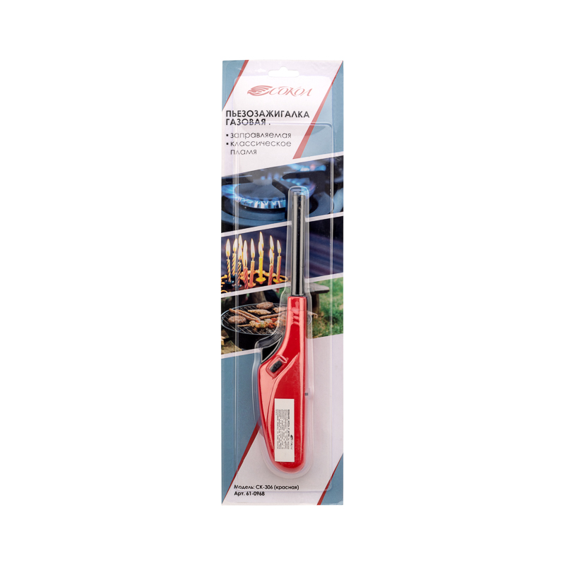 Бытовая газовая пьезозажигалка с классическим пламенем многоразовая (1 шт.) красная СК-306 СОКОЛ