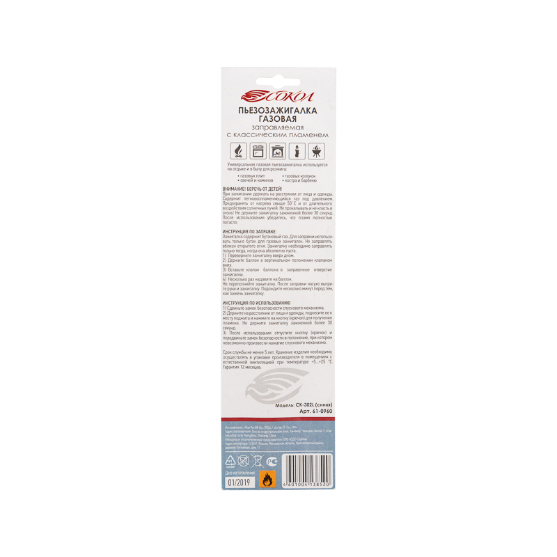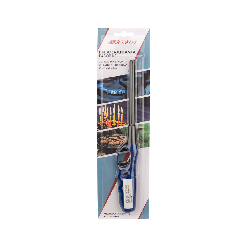Бытовая газовая пьезозажигалка с классическим пламенем, многоразовая (1 шт.) синяя СК-302L СОКОЛ