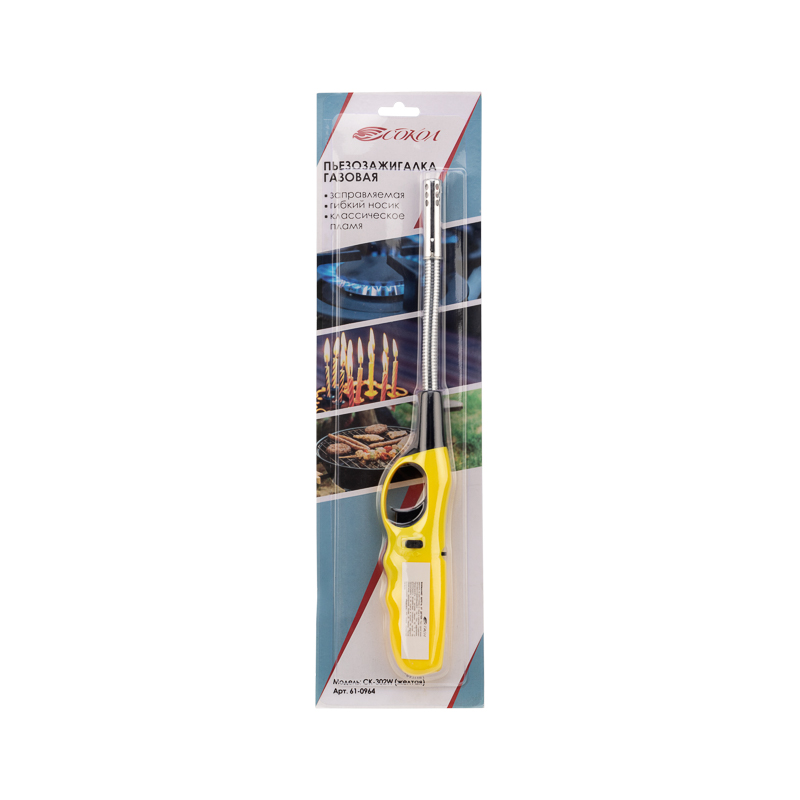 Зажигалка газовая бытовая, с пьезоэлементом и гибким стержнем.