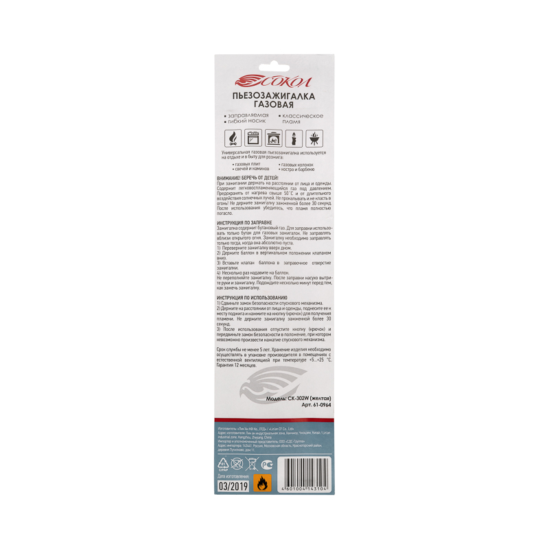 Бытовая газовая пьезозажигалка с классическим пламенем многоразовая (1 шт.) желтая СК-302W с гибким стержнем СОКОЛ