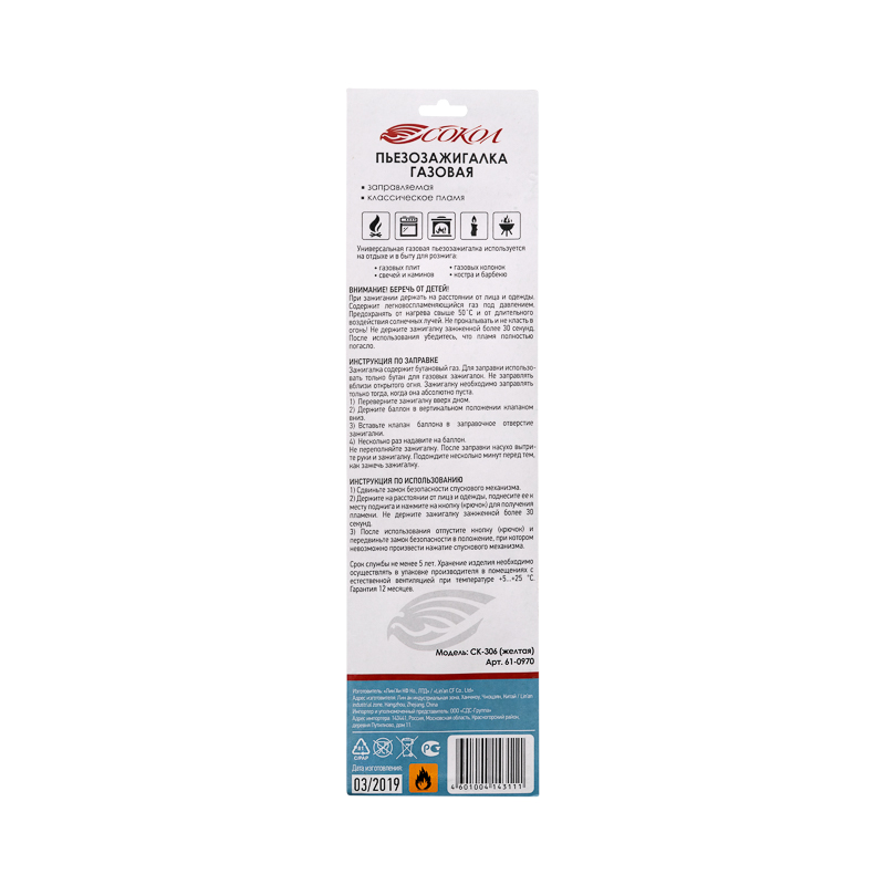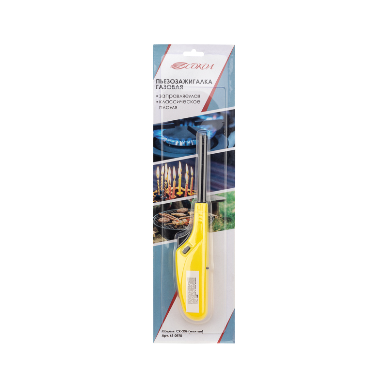 Бытовая газовая пьезозажигалка с классическим пламенем многоразовая (1 шт.) желтая СК-306 СОКОЛ