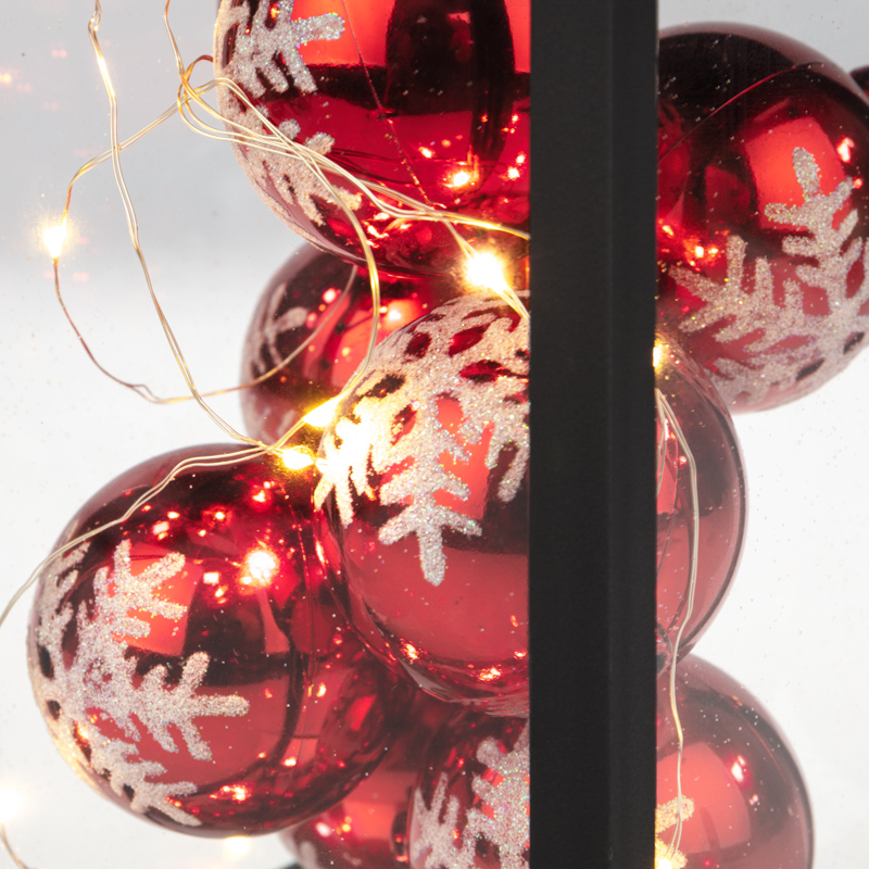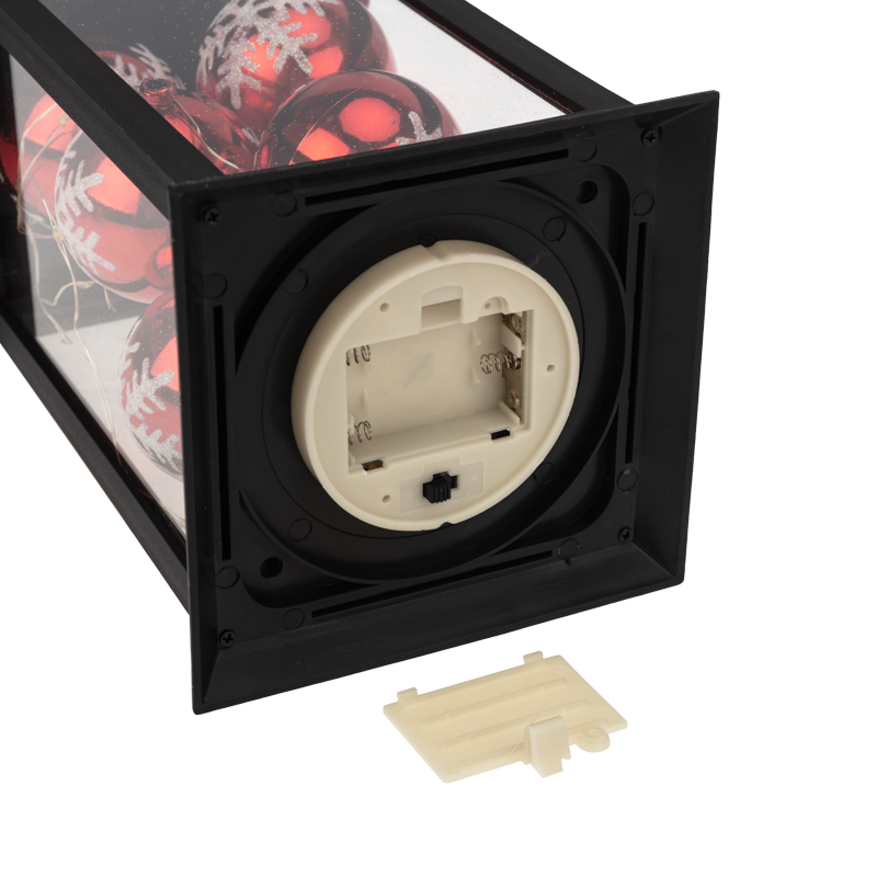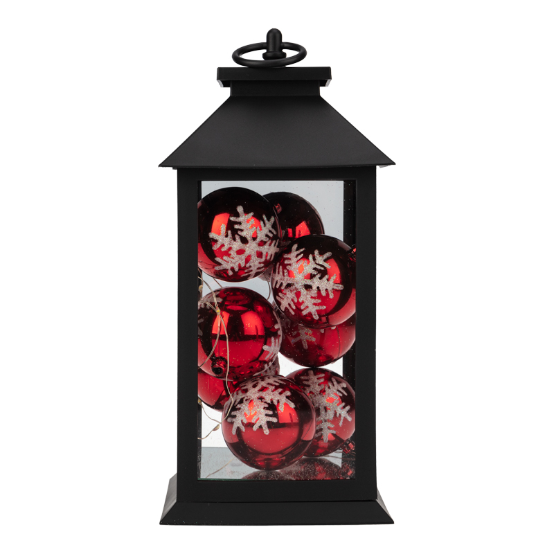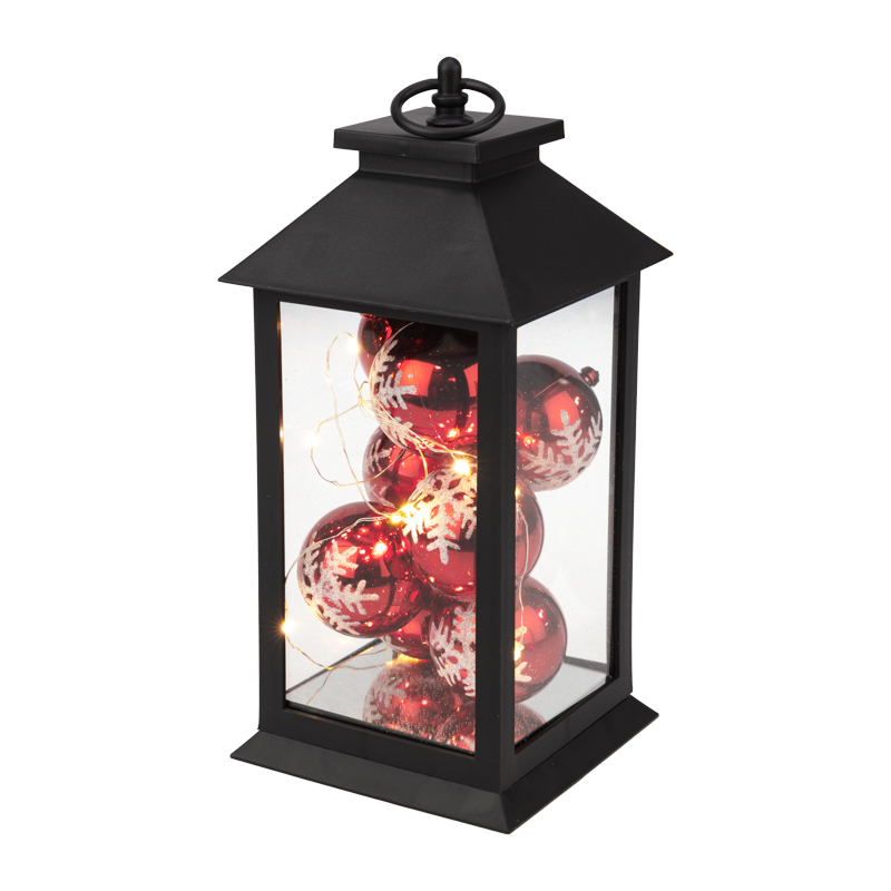 Декоративный фонарь с шариками олицетворяет тепло и домашний уют в преддверии Нового года, помогает сделать домашние вечера в кругу семьи комфортными и поднимает настроение окружающим. Оригинальное изделие в корпусе черного цвета станет стильным дополнением праздничной обстановки. Для подвешивания предусмотрено кольцо в верхней части. Экономичные диоды, подсвечивающие композицию, излучают теплый белый свет. В качестве элементов питания используются 3 батарейки тип ААА, которые делают фонарь мобильным – для работы не нужна розетка.