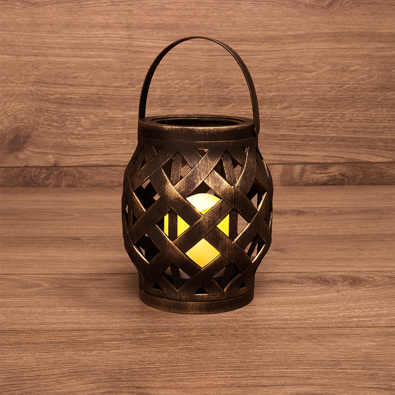 Декоративный фонарь со свечкой в плетеном корпусе бронзового цвета — стильное, оригинальное и безопасное светодиодное украшение для интерьера. В центре находится фигурка, выполненная в виде восковой свечи. Диод, излучающий белый свет теплого оттенка, имитирует настоящее пламя, не нагревается и экономно расходует энергию. Фонарь получает питание от 3 батареек типа ААА и не нуждается в розетке. На корпусе предусмотрен выключатель ON/OFF. Изделия на батарейках абсолютно безопасны в использовании.