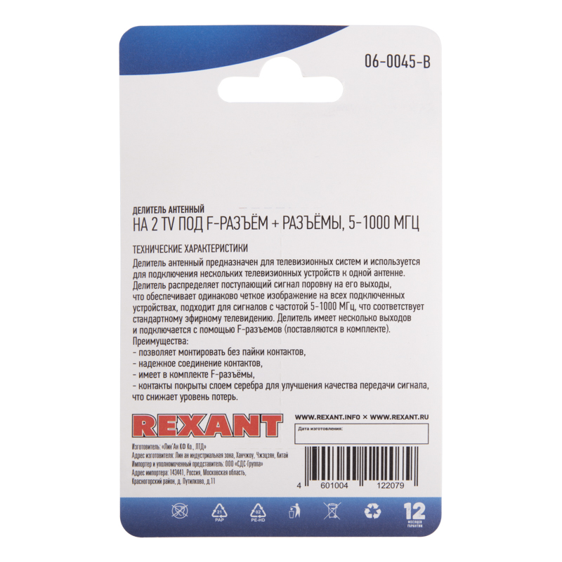 Полоса пропускания делителя от 5 до 1000МГц, что соответствует стандартному эфирному телевидению.