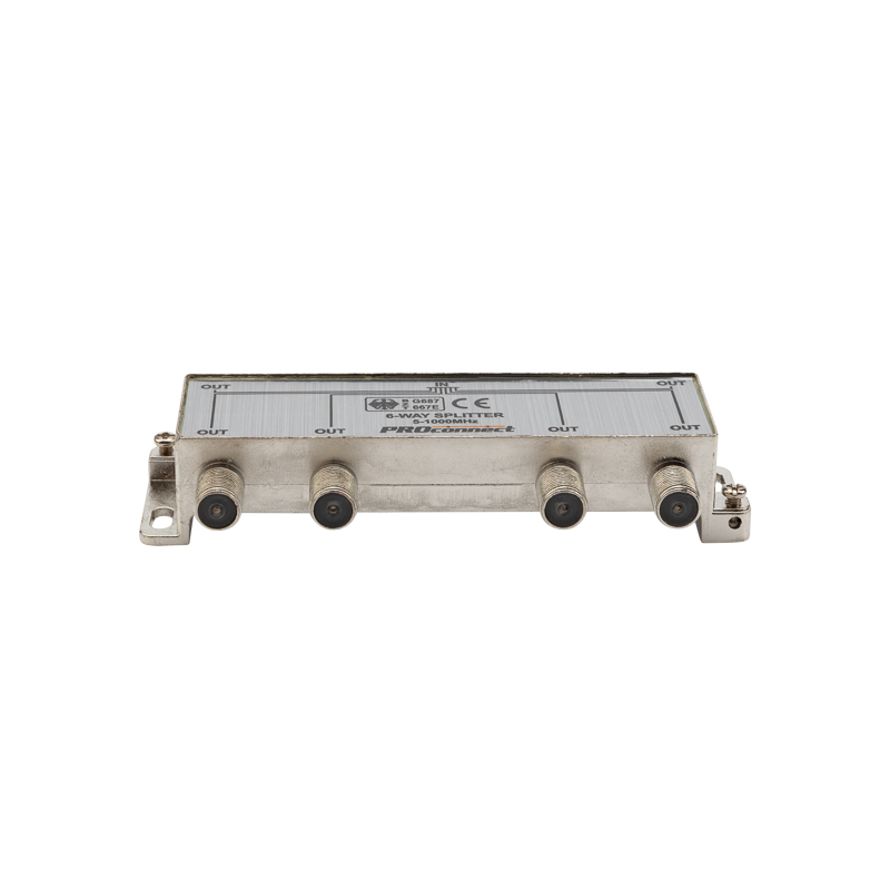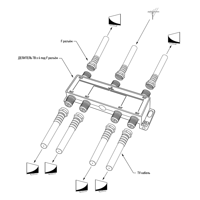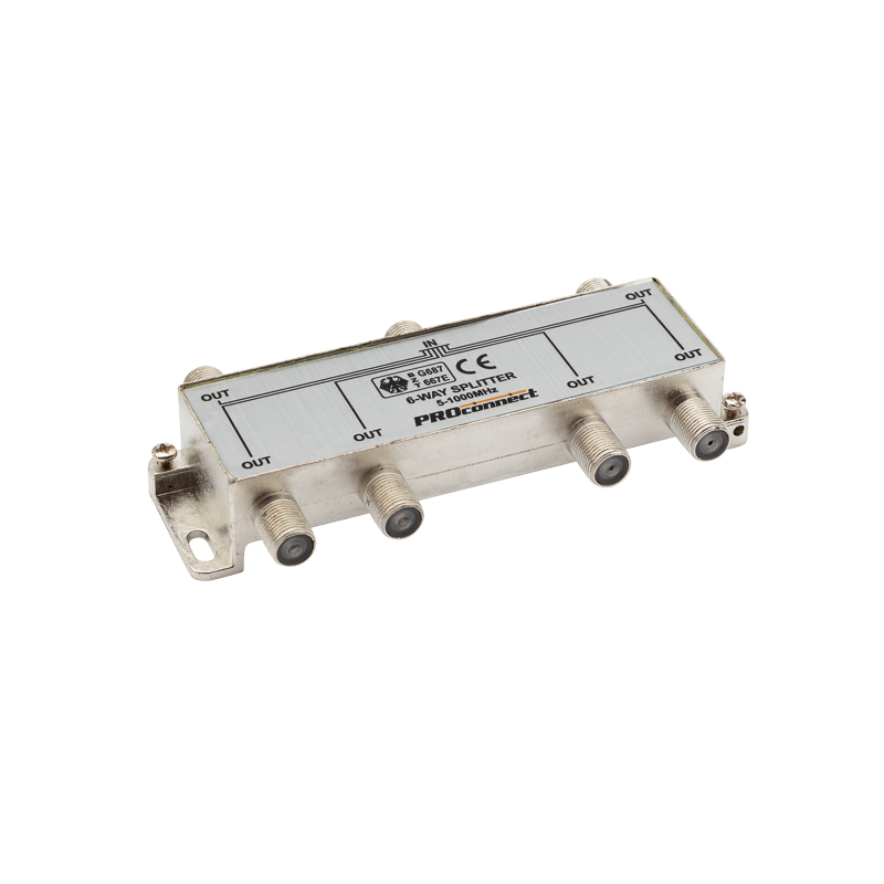 Данный ТВ сплиттер рассчитан под F разъём и имеет шесть выходов, т. е. сигнал, проходящий через сплиттер, делится на шесть частей. Кабель подключается к этому делителю с помощью F-разъемов.
