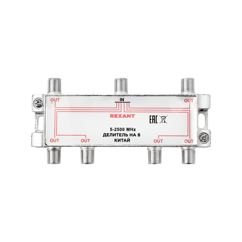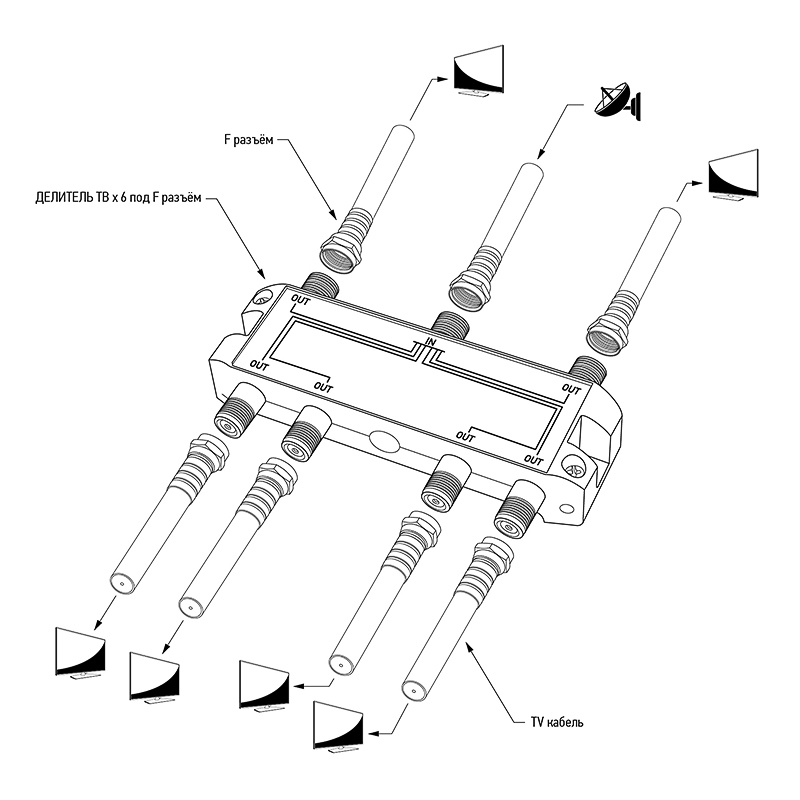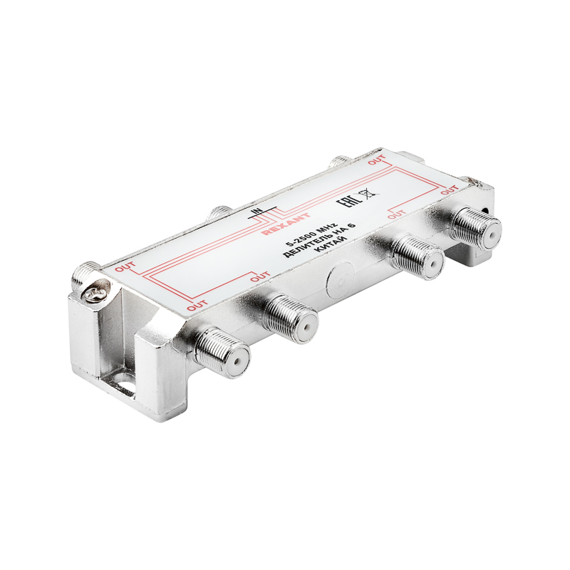 Делитель оснащен одним входом под F разъем и шестью выходами, также под F разъемы.