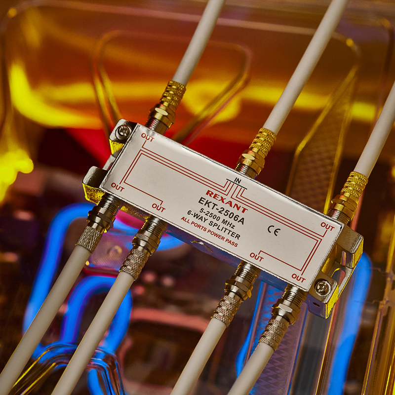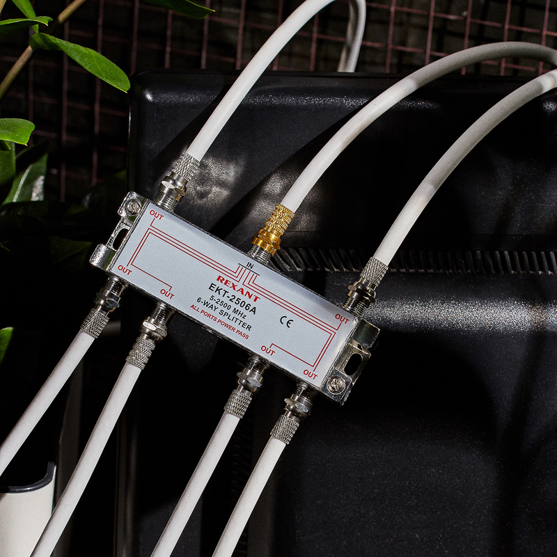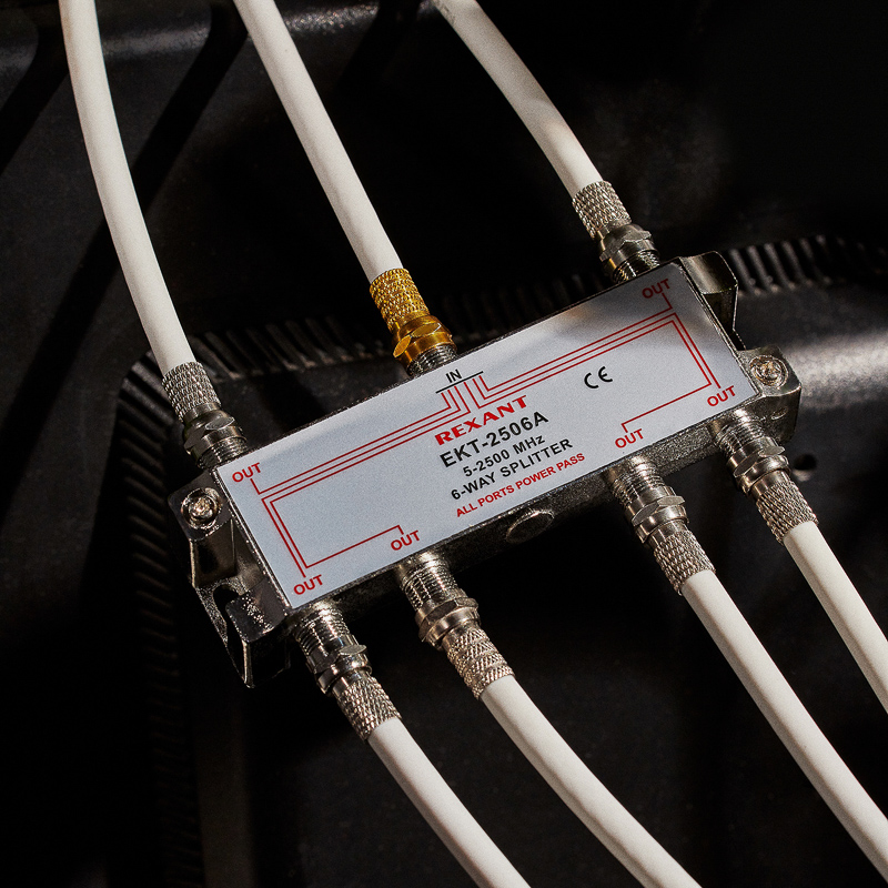 Сигнал, подающийся на вход, делится на шесть равных частей и передается на выходы. Для подключения кабелей используются стандартные F-разъемы.