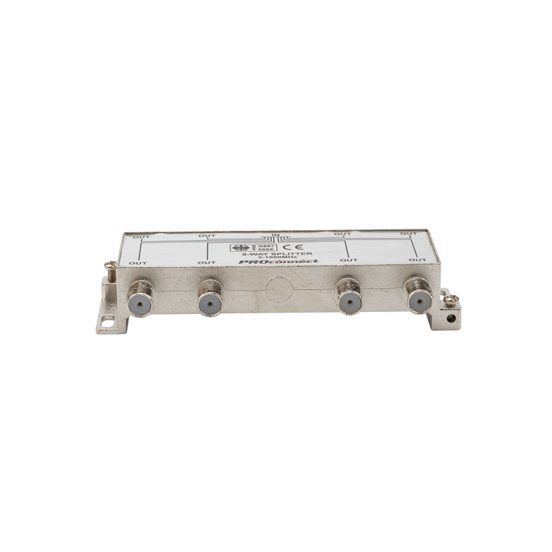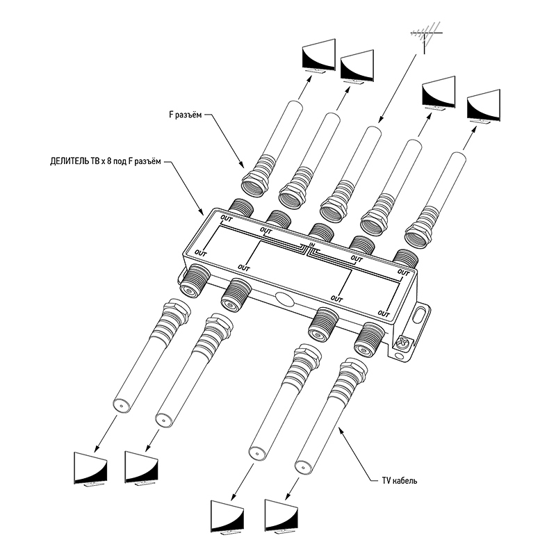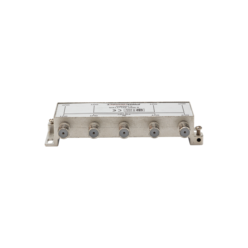 Данный ТВ сплиттер рассчитан под F разъём и имеет восемь выходов, т. е. сигнал, проходящий через сплиттер, делится на восемь частей. Кабель подключается к этому делителю с помощью F-разъемов.