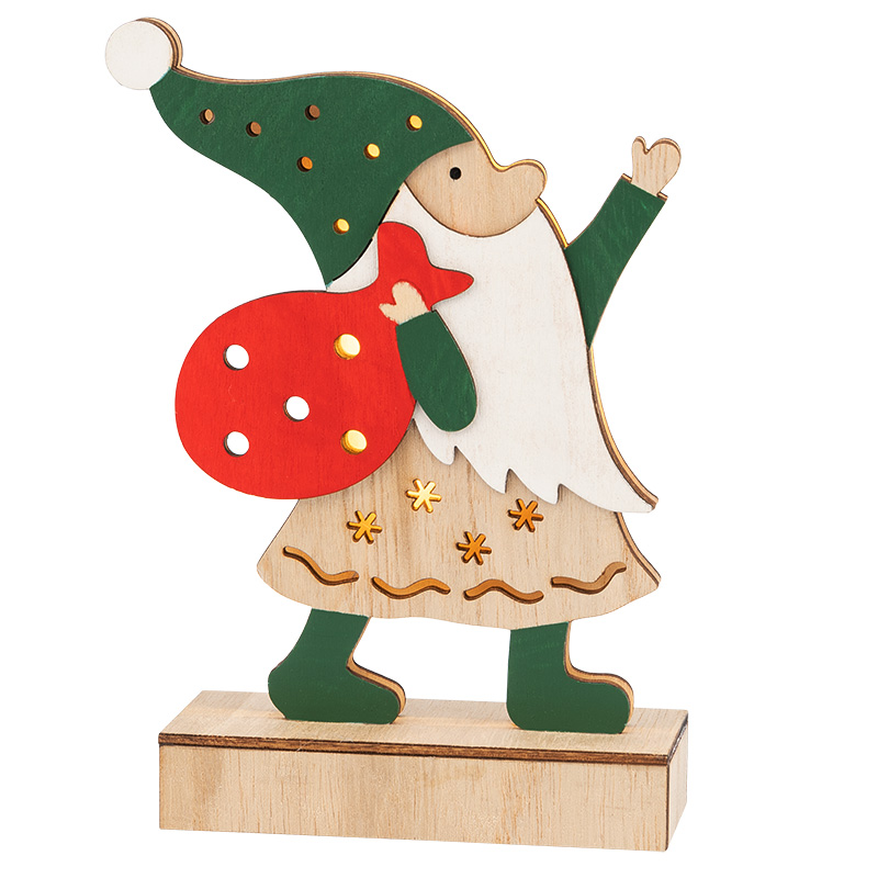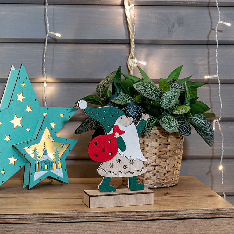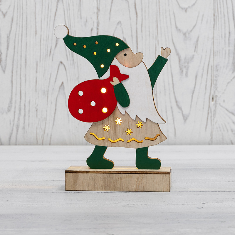 Деревянная фигурка с подсветкой «Дед Мороз» высотой 18 см работает от двух батареек типа ААА, поэтому ее можно разместить в любом уголке вашего дома, не уделяя внимание поиску розеток. Изделие, произведенное из экологичных материалов, станет прекрасным подарком к новогодним праздникам, который вызовет только приятные эмоции. 5 экономичных диодов теплого белого свечения мягко обрамляют композицию, создавая атмосферу тепла и уюта. Фигурка предназначена для использования в помещениях с умеренной влажностью.
