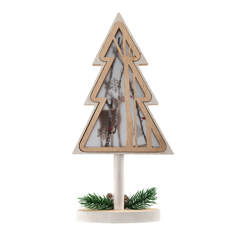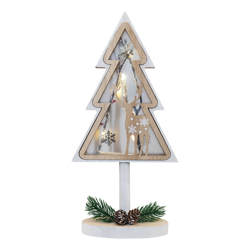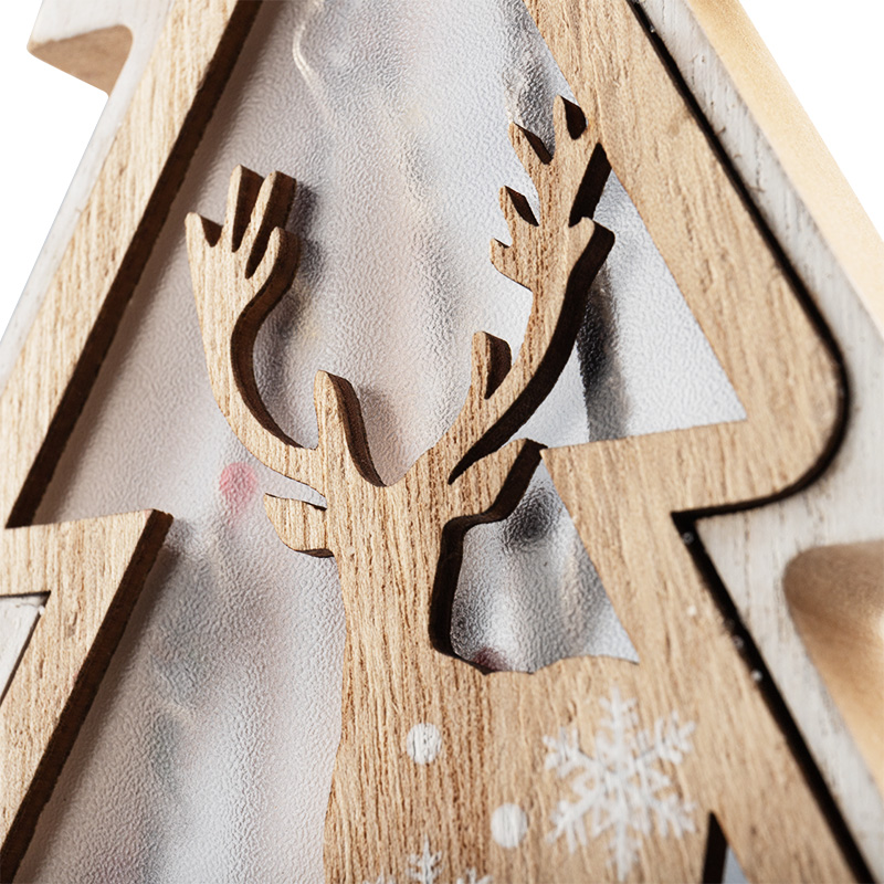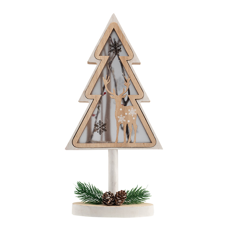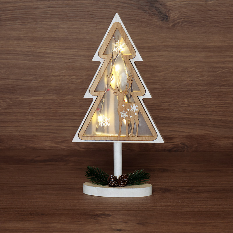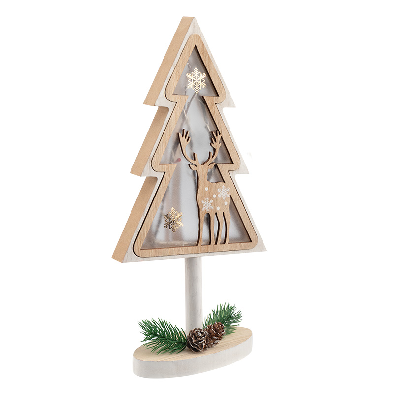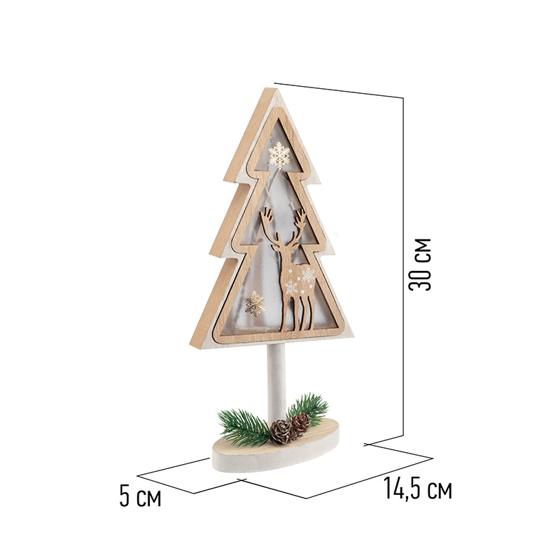 Деревянная фигурка с подсветкой «Елка на подставке» 14,5×5×30 см — оригинальный интерьерный декор, созданный, чтобы дарить тепло и ощущение уюта. В основе композиции находится фигура елочки с резным дополнением в виде оленя. Матовую поверхность украшают расписные снежинки, на подставке расположены хвойные веточки с двумя шишками — главные атрибуты зимних праздников. Деревянная фигурка с подсветкой работает от 1 батарейки типа CR2032, предназначена для использования в отапливаемых помещениях с умеренной влажностью.