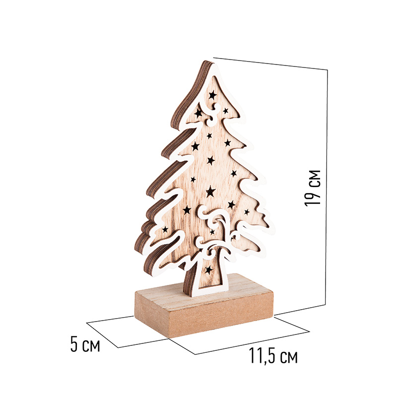 Деревянная фигурка с подсветкой «Елочка» 11,5×5×19 см — оригинальное интерьерное украшение, которое подарит ощущение уюта и тепла, создаваемое аутентичной фактурой дерева и мягким свечением трех диодов. Декоративное изделие работает от 2 батареек типа ААА. Светодиоды экономно расходуют заряд, превращая всю энергию в свет и не нагреваются. В нижней части корпуса предусмотрена клавиша включения и выключения. Деревянная фигурка с подсветкой станет прекрасным подарком к Новому году и Рождеству.