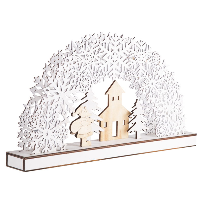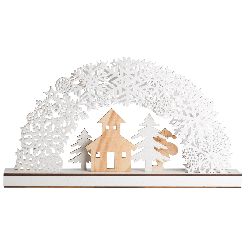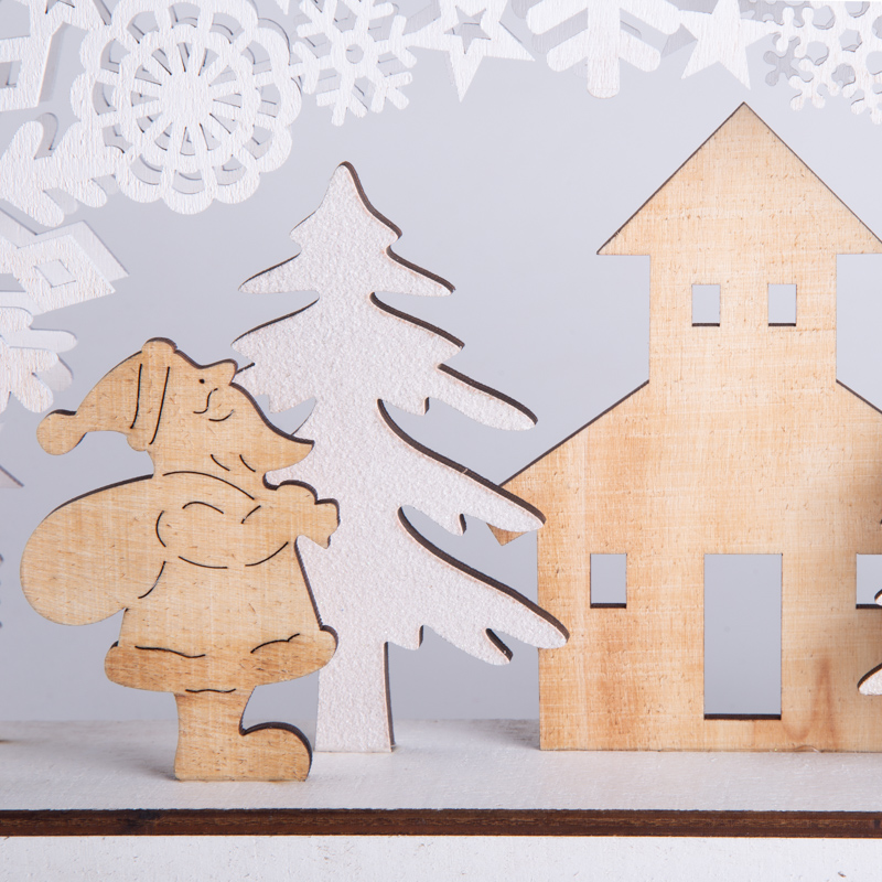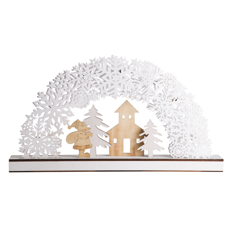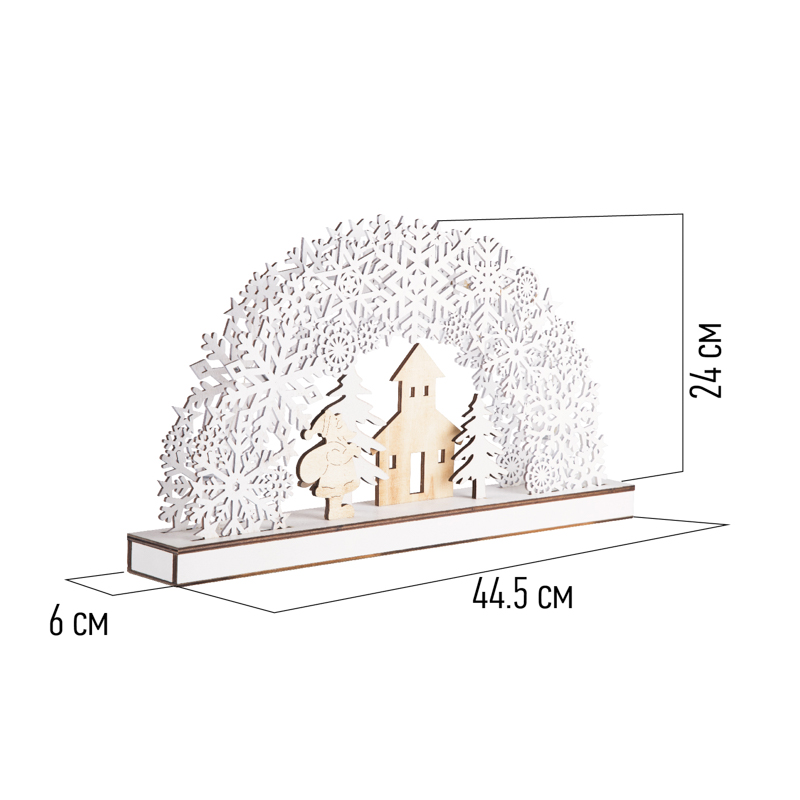 Деревянная фигурка с подсветкой «Рождественская сказка» 44,5×6×24 см представляет собой затейливую композицию из фигурок елей, Деда Мороза с мешком подарков и большой радуги из резных снежинок. 7 ярких диодов эффектно подсвечивают декор и питаются от 2 батареек типа ААА. Светодиоды экономичны, долговечны и абсолютно безопасны. Удобная подставка подходит для размещения на любой ровной поверхности. Фигурка «Рождественская сказка» — идеальный подарок к Новому году, который порадует и детей, и взрослых.