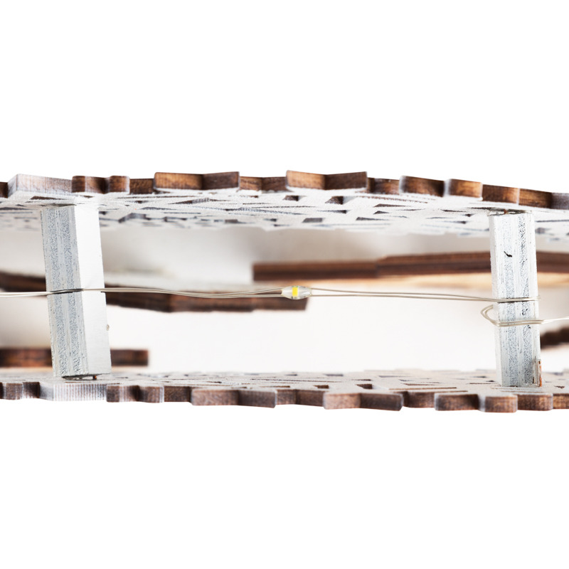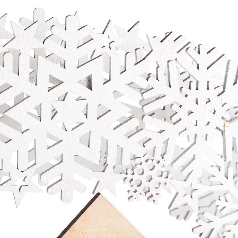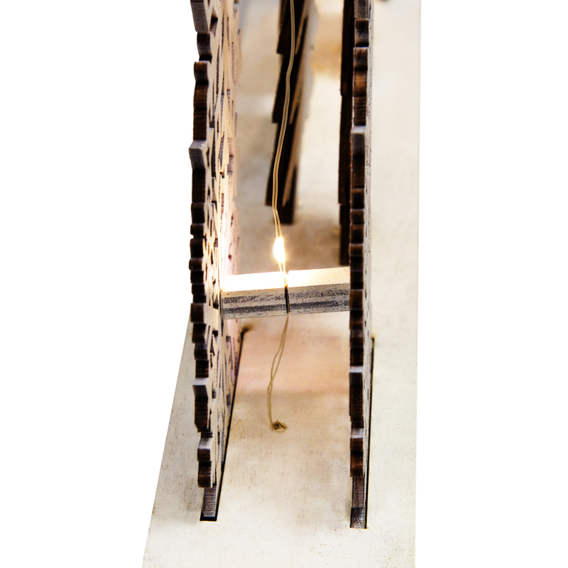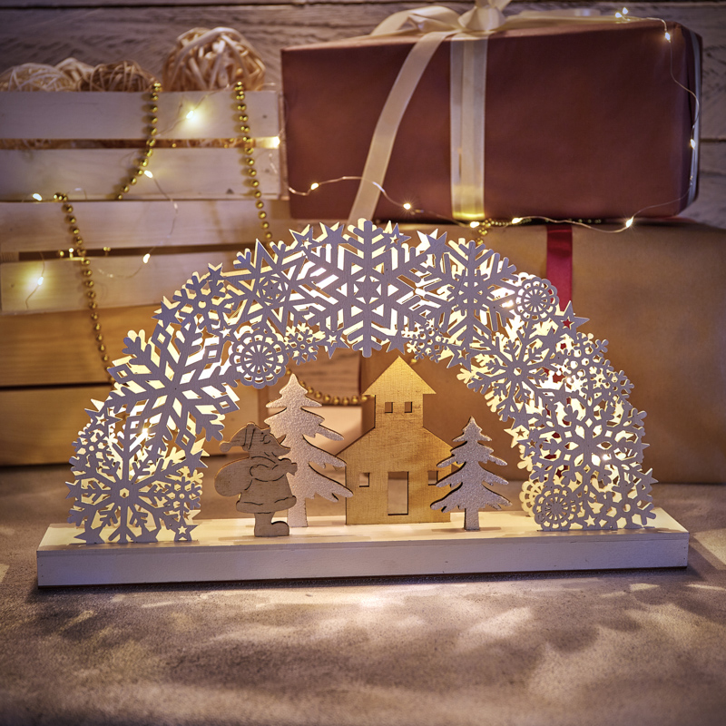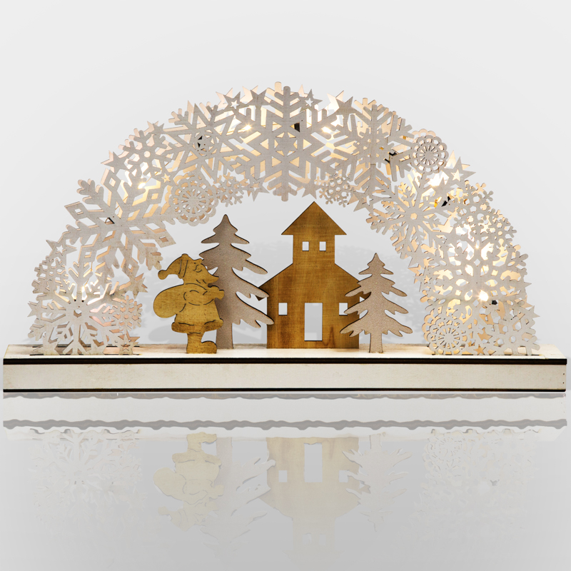 Деревянная фигурка с подсветкой «Рождественская сказка» 44,5×6×24 см представляет собой затейливую композицию из фигурок елей, Деда Мороза с мешком подарков и большой радуги из резных снежинок. 7 ярких диодов эффектно подсвечивают декор и питаются от 2 батареек типа ААА. Светодиоды экономичны, долговечны и абсолютно безопасны. Удобная подставка подходит для размещения на любой ровной поверхности. Фигурка «Рождественская сказка» — идеальный подарок к Новому году, который порадует и детей, и взрослых.