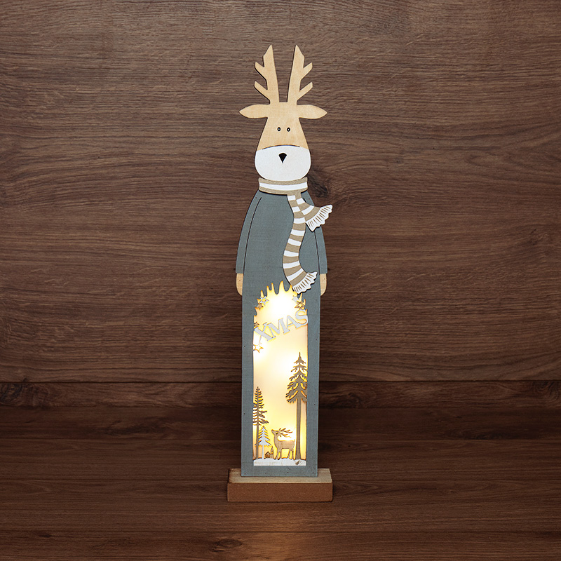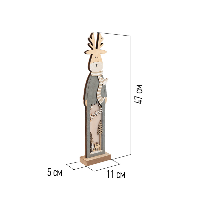 Деревянная фигурка с подсветкой «Рождественский олень» 11×5×47 см — милая интерьерная композиция, которая гармонично дополнит праздничную обстановку. Изделие произведено из природной древесины, в составе красителя нет вредных веществ — материалы гипоаллергенны и подходят для детских игр. Фигурка подсвечивается 5 яркими диодами, которые создают эффект объемных деталей и дарят ощущение тепла в холодные зимние вечера. Светодиоды работают от двух батареек типа ААА, поэтому декоративное изделие не зависит от розетки.