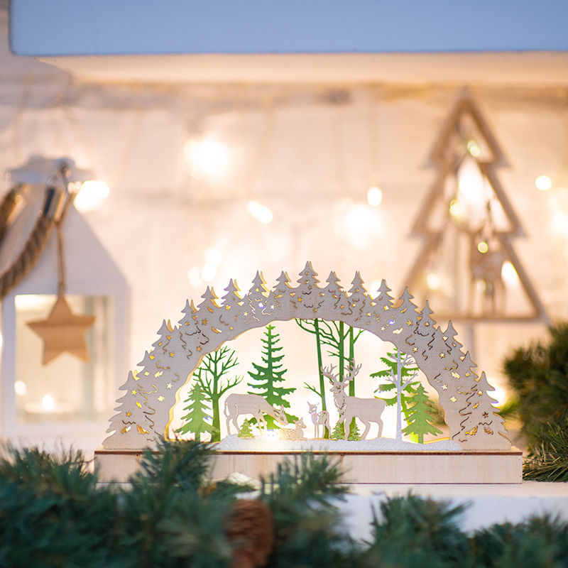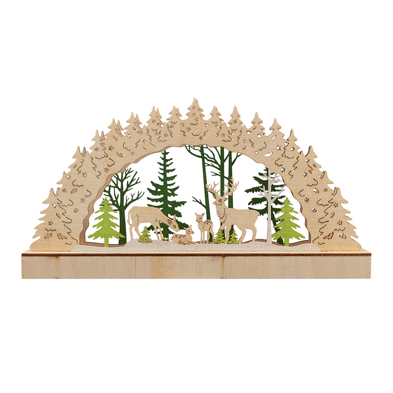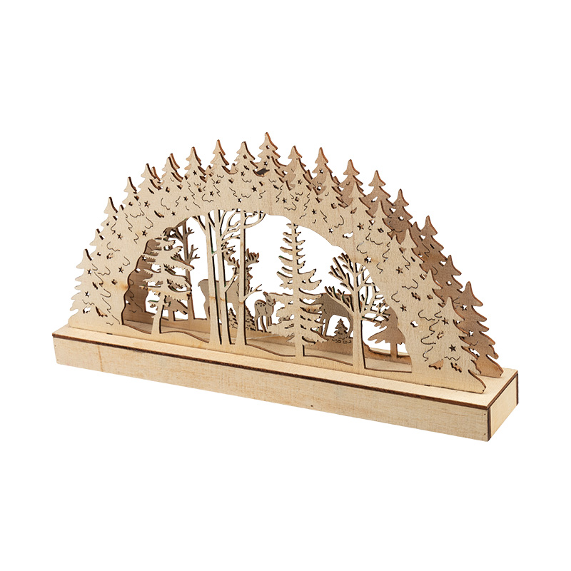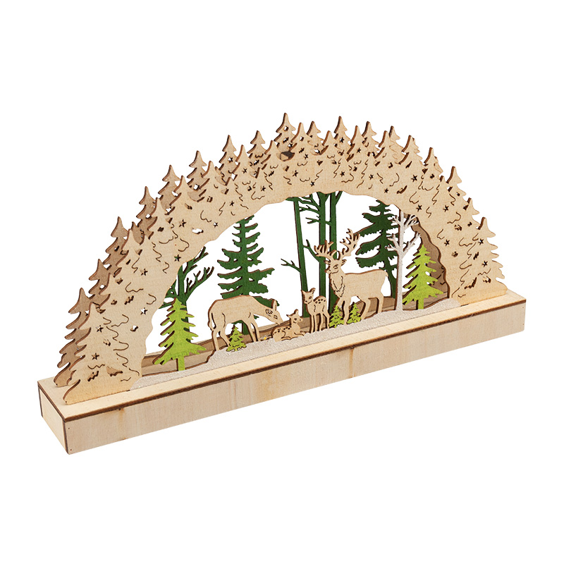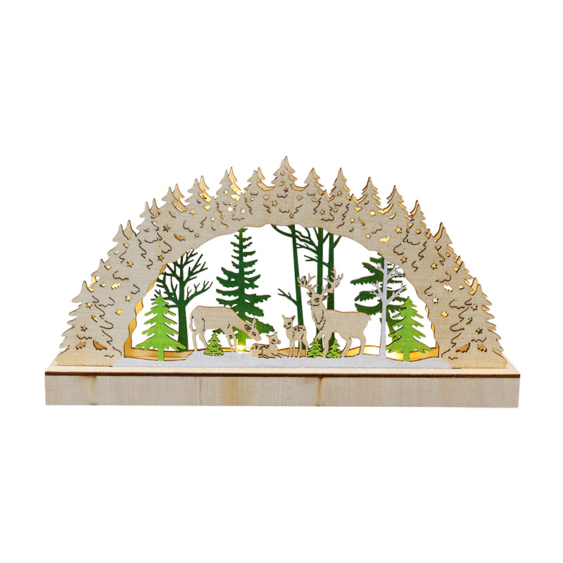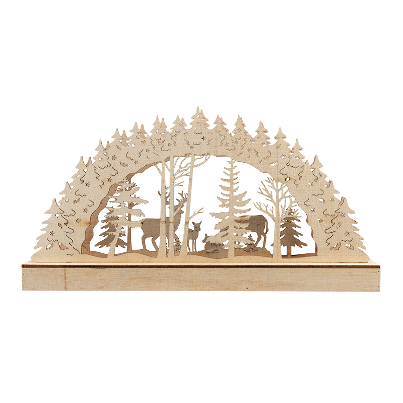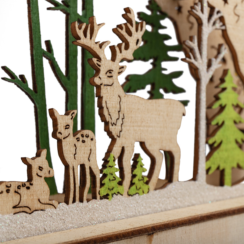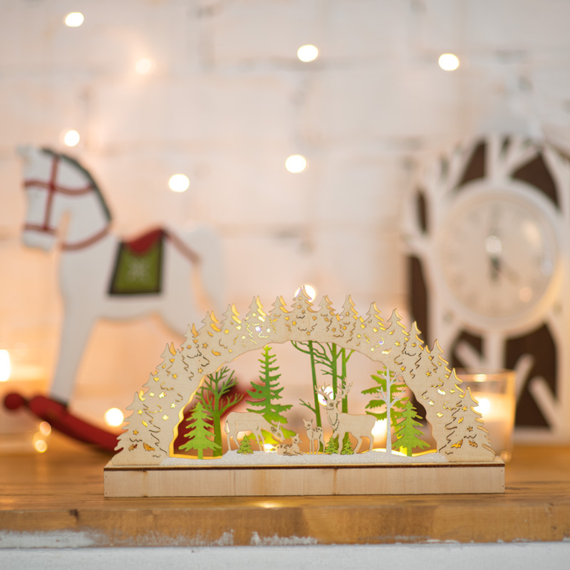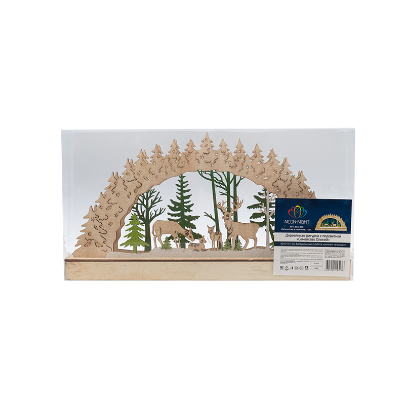 Деревянная фигурка с подсветкой «Семейство оленей» 30×5×15,7 см станет великолепным украшением интерьера, внесет нотку тепла и подарит ощущение зимней сказки окружающим. Композиция из фигур деревьев, оленей размещена на устойчивой платформе, которую можно поставить на любую ровную поверхность. Изделие выполнено из натуральной древесины. 6 безопасных светодиодов получают питание от 2 батареек типа ААА и экономно расходуют энергию, превращая ее в яркий белый свет теплого оттенка. Деревянная фигурка «Семейство оленей» предназначена для использования в сухих отапливаемых помещениях.