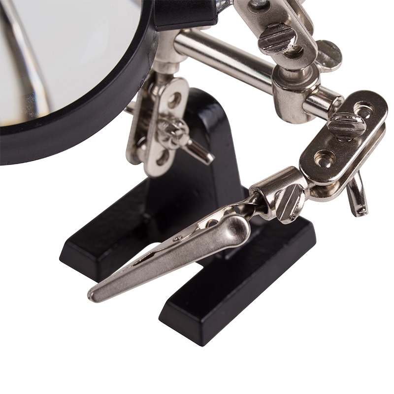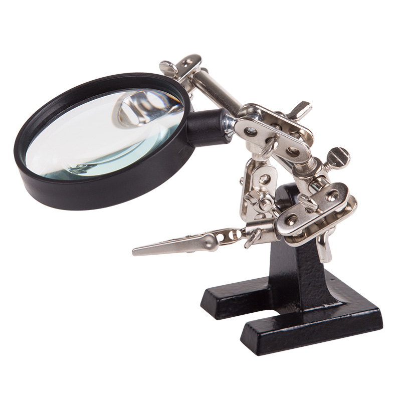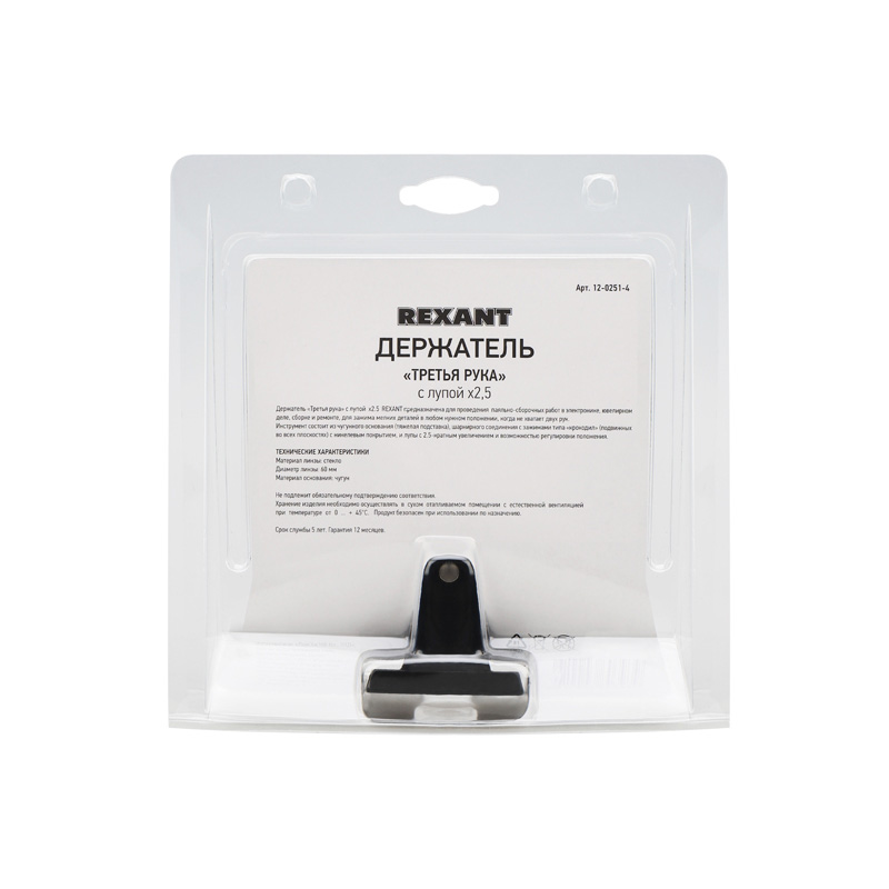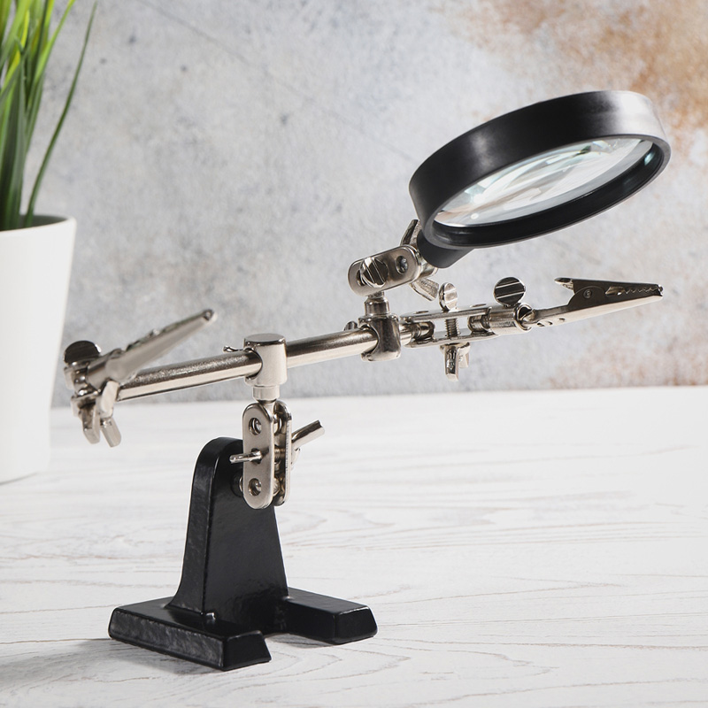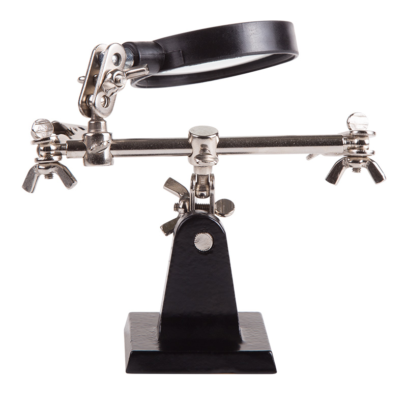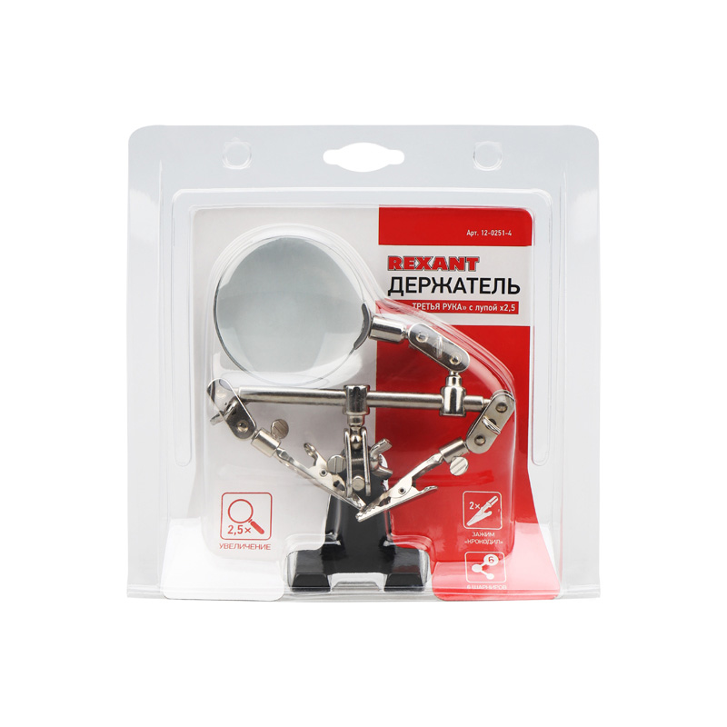 Держатель «третья рука» с лупой х2.5 REXANT служит, главным образом, при проведении паяльно-сборочных работ в электронике, ювелирном деле, сборке и ремонте для зажима мелких деталей в любом нужном положении, когда не хватает двух рук.